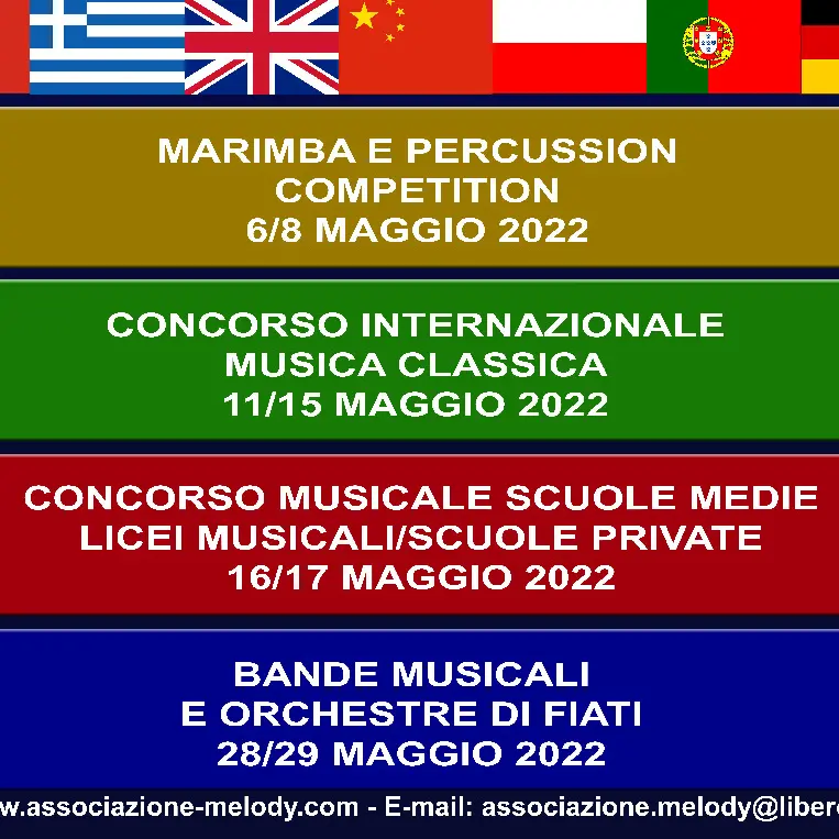 Moltissime saranno le esibizioni in programma: il 6 e l’8 maggio andrà in scena “Marimba & Percussion Competitions”, l’11 e il 15 maggio il “Concorso internazionale di musica classica”, il 16 e il 17 maggio il “Concorso musicale per scuole medie e licei musicali e scuole private”, il 28 e il 29 “Bande musicali e orchestre di fiati”.
