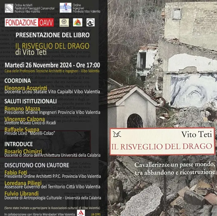 La Casa delle professioni tecniche, architetti e ingegneri di Vibo Valentia ospiterà martedì 26 novembre alle ore 17.00 la presentazione del libro Il risveglio del drago di Vito Teti. L’appuntamento culturale, coordinato dalla docente del liceo Capialbi Eleonora Accoriti, prevede i saluti istituzionali di Romano Mazza, presidente dell’Ordine degli ingegneri della Provincia di Vibo, del direttore del Museo civico di Ricadi Vincenzo Calzona, del preside del liceo Morelli-Colao Raffaele Suppa. L’introduzione sarà a cura di Rosario Chimirri, docente di storia dell’Architettura Università della Calabria. Discuteranno con l’autore il presidente dell’Ordine degli architetti Fabio Foti, l’assessore comunale Loredana Pileggi e il docente di Antropologia culturale-Università della Calabria, Fulvio Librandi.
