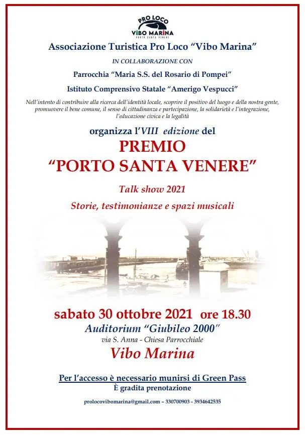 Dopo due anni di attesa a causa della pandemia, torna il “Premio Porto Santa Venere 2021”, giunto alla sua ottava edizione. L’appuntamento è a Vibo Marina sabato 30 ottobre alle ore 18.30 presso l’auditorium Giubileo 2000 della chiesa parrocchiale. L’evento, organizzato anche questa volta dalla Pro Loco di Vibo Marina, manterrà l’ormai tradizionale format del talk-show, che vedrà protagoniste tre storie importanti e coinvolgenti, accompagnate da spazi musicali dal vivo.