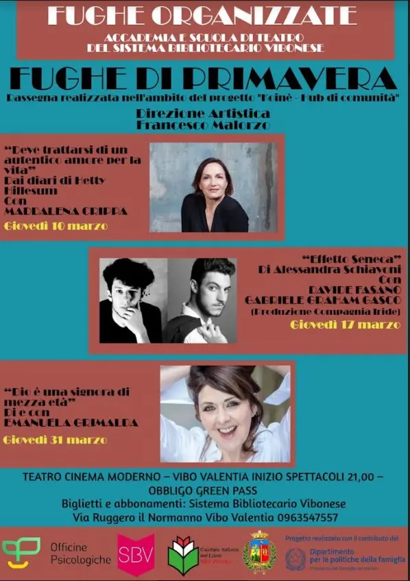 La rassegna teatrale “Fughe di primavera” è realizzata nell’ambito del progetto “Koine – Hub di Comunità” promosso dal SBV e finanziato dal Dipartimento per le politiche della famiglia, e rientra inoltre tra le attività di “Vibo Valentia – Capitale del Libro 2021”.