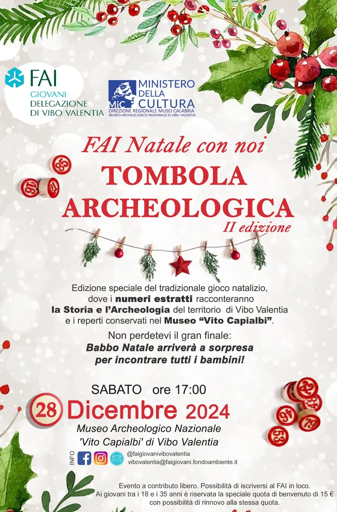 Dopo l’ampia partecipazione e il successo registrato nell’edizione 2023, il Museo Capialbi di Vibo Valentia ospiterà il 28 dicembre, alle ore 17.00 la Tombola archeologica. L’evento è reso possibile grazie al sinergico lavoro del polo culturale con il Fai giovani e i ragazzi dei Servizi educativi del Museo archeologico nazionale di Vibo Valentia – Dr Musei Calabria. Per il gran finale previsto l’arrivo di Babbo Natale che a sorpresa incontrerà i piccoli ospiti.