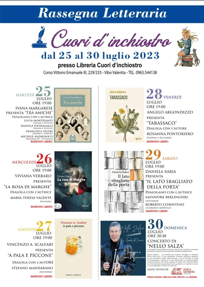 Molti gli autori di origine calabrese che con il loro talento di scrittori hanno dimostrato come ormai la Calabria non sia un mondo a se’ stante, ma ‘il mondo’, intessendo e intrecciando rapporti e collaborazioni con scrittrici e scrittori d’ogni parte d’Italia. Ad aprire la Rassegna sarà Ivana Margarese, docente e scrittrice siciliana. La kermesse si concluderà domenica 30 luglio con il concerto di Nello Salza, il trombettista che ha collaborato per 35 anni con il Maestro Ennio Morricone. Tutti gli eventi sono gratuiti e a ingresso libero. È richiesta la prenotazione presso la Libreria.