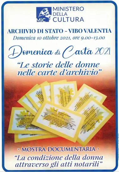 Nell’ambito della “Domenica di Carta”, promossa a cadenza annuale dal ministero della Cultura, domenica 10 ottobre dalle ore 09.00 alle ore 13.00, l’Archivio di Stato di Vibo Valentia organizza una mostra dal titolo “La condizione della donna attraverso gli atti notarili”. Si percorrerà un arco temporale che va dal 1765 al 1866, con testimonianze preziose (attraverso atti notarili), della vita delle donne in ogni ambito: sociale e personale. Contratti di nozze, donazioni di schiave, “donatio” nei confronti della moglie, capitoli matrimoniali, fughe delle proprie case per dissapori coniugali, scioglimenti definitivi di promesse di nozze, locazione delle proprie figlie presso uomini benestanti in cambio di lavori domestici.
