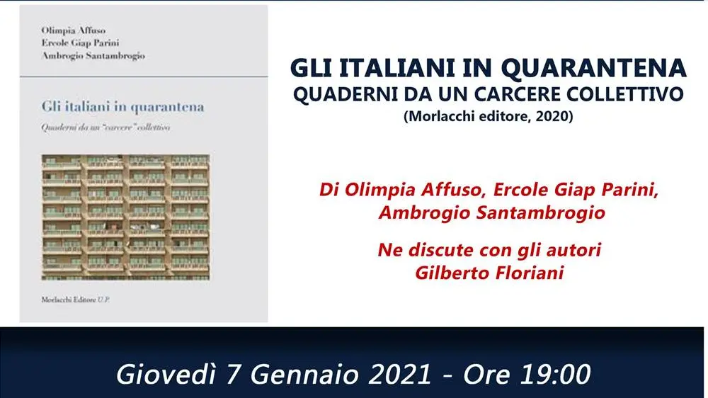 Ad inaugurare la rassegna giovedì 7 gennaio alle ore 19 la presentazione del volume “Gli italiani in quarantena. Quaderni da un carcere collettivo” (Morlacchi editore, 2020) di Olimpia Anfuso, Ercole Giap Parini, Ambrogio Santambrogio. «È un libro estremamente interessante – dichiara Floriani, che ne discuterà con gli autori durante la diretta – che con taglio sociologico racconta quello che è accaduto nella nostra società per effetto della pandemia da Covid-19, cosa ha comportato la fine delle routine alle quali eravamo abituati e le pratiche e le aspettative che l’esperienza del lockdown hanno fatto maturare. È importante capire come lo stato di eccezione sociale che abbiamo vissuto abbia inciso sul senso comune che guida la nostra vita e come saremo individualmente e come società dopo che tutto, speriamo presto, sarà finito».