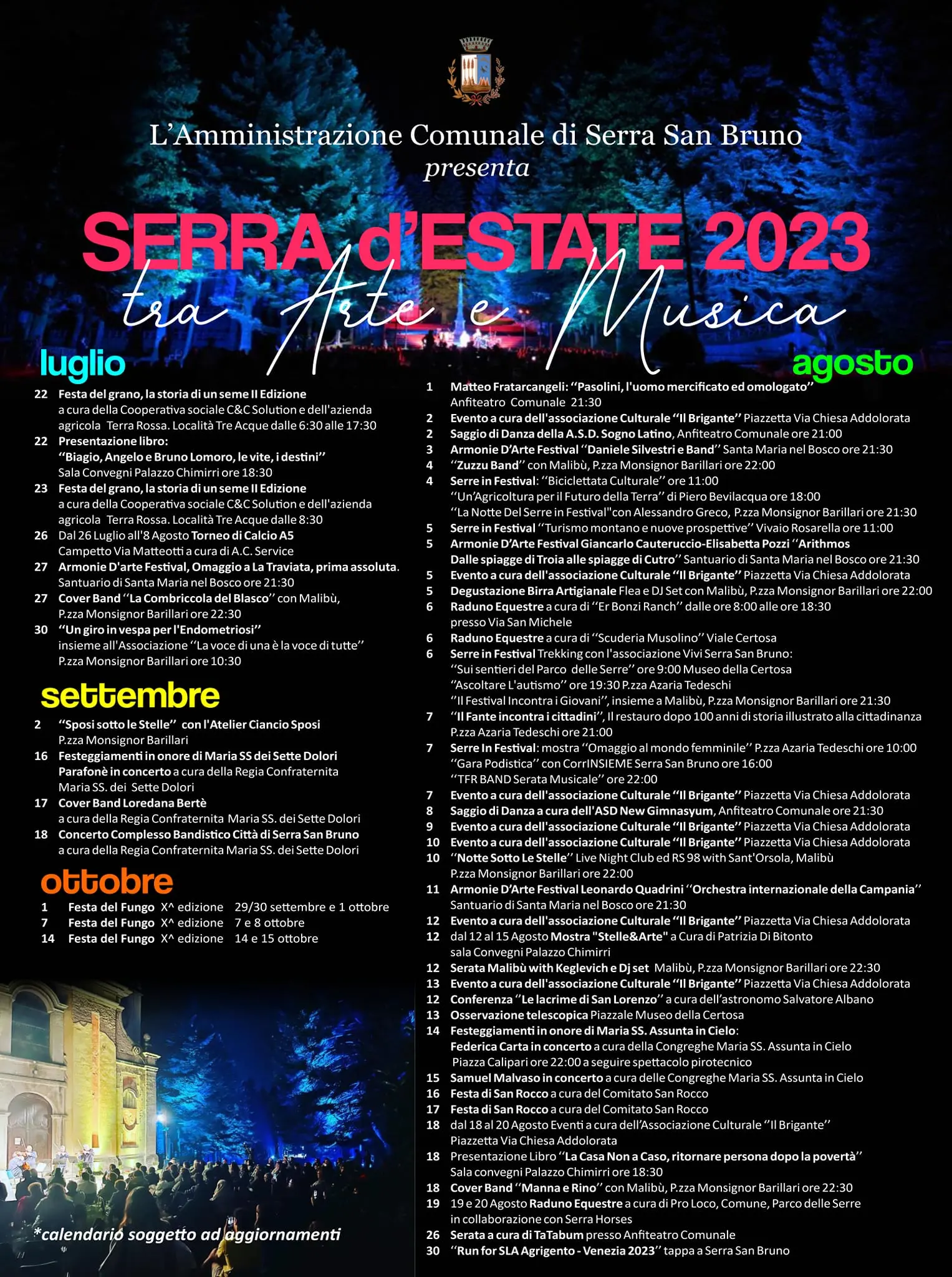 Anche quest’anno ritornano gli eventi serresi di “Serra d’Estate 2023, tra arte e musica”. Tanti gli appuntamenti da non perdere nella magnifica cornice di Serra San Bruno a partire dal 22 luglio. «Un’estate in musica, arte, cultura ed ecosostenibilità quella che attende i cittadini serresi e chiunque vorrà visitare e sostare nella nostra cittadina in questo 2023». Il sindaco Alfredo Barillari lascia trasparire soddisfazione anche quando parla della rinnovata collaborazione con Chiara Giordano e Armonie d’Arte Festival. «Dopo il successo straordinario dello scorso anno Armonie d’Arte si è fatto in quattro, con quattro splendide serate dedicate al tema degli Approdi col magnifico sfondo del Santuario di Santa Maria del Bosco ad incorniciare il tutto: si comincia il 27 luglio con “Omaggio a La Traviata”, poi il 3 agosto per l’unica data di Daniele Silvestri in Calabria. Si prosegue il 5 agosto con “Arithmos, dalle spiagge di Troia alle spiagge di Cutro” con la regia di Giancarlo Cauteruccio e la voce di Elisabetta Pozzi. L’Orchestra internazionale della Campania diretta dal maestro Quadrini chiuderà il Festival l’11 agosto». Grande soddisfazione anche per il consigliere Sabina Maiolo: «Questa Serra d’Estate 2023 è frutto della sinergia tra l’amministrazione, le congreghe, le confraternite e le associazioni locali che collaborano attivamente sul territorio e che ringrazio. Ancora una volta siamo riusciti a creare un’estate attraente per persone di tutte le età e di tutti i gusti con un occhio di riguardo all’ecosostenibilità e soprattutto al risparmio per le casse dell’ente e dunque dei cittadini». «Gli appuntamenti si prolungheranno poi -ha continuato -non solo nelle giornate agostane ma anche a settembre e ad ottobre con la decima edizione della Festa del fungo organizzata in collaborazione con la Pro Loco di Serra San Bruno e il Parco delle Serre».