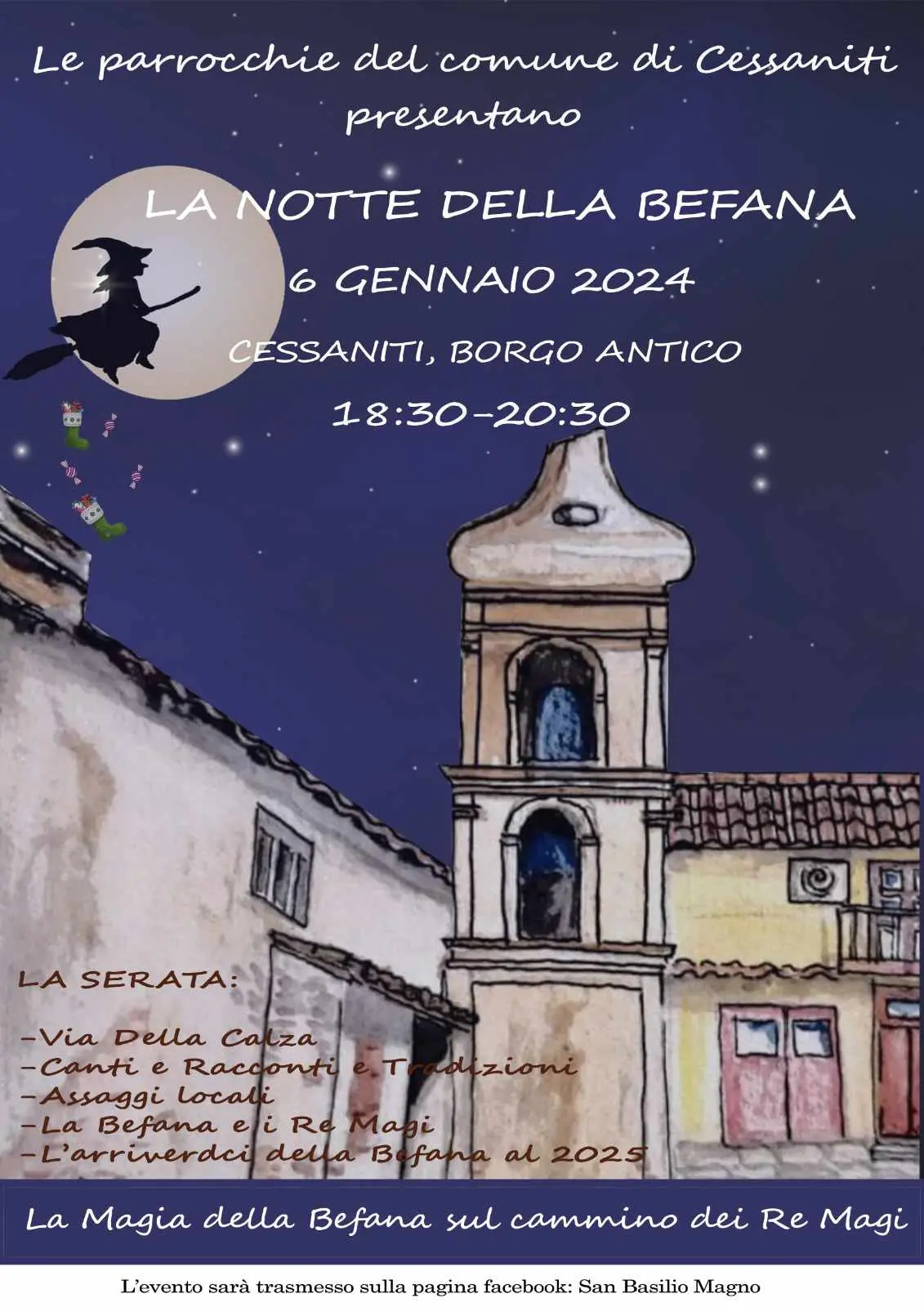 Ricordata poi l’essenza della giornata del 6 gennaio: «Anche se le origini sono religiose, oggi la festa viene legata all’iconica figura della Befana, la vecchietta che a bordo di una scopa volante porta calze con dolciumi ai bambini buoni, carbone a tutti quelli che non si sono comportati bene durante l’anno appena finito e, nel contempo, porta la purificazione nelle case e nei cuori della gente come seme di rinascita all’inizio dell’anno che verrà. Richiamare l’attenzione sul valore del donare agli altri, di imparare ad occuparsi del prossimo e di chi sta intorno a noi è il tema che con questa iniziativa, il comitato promotore, intende diffondere e promuovere in quest’epoca difficile e dove l’egoismo sembra prevalere». E ancora: «Oggi, ricordare e affrontare questi argomenti è essenziale, dare un significato alle ricorrenze è fondamentale e a chi organizza questo evento non sfugge l’importanza di stare insieme. Infatti, la manifestazione si svolge grazie alla spinta e alla preziosa partecipazione diretta dei parroci nella rappresentazione dei tre Re Magi e di volontari delle diverse frazioni di Cessaniti per dare un senso di unitarietà di tutta la comunità e, in particolare, proporre un modello partecipativo legato all’intero territorio con la speranza che si possa ripetere e affermare per il futuro. Ci sembra – concludono i volontari- una bella opportunità per iniziare insieme il nuovo anno e augurare prosperità a tutta la cittadinanza ed a quanti verranno a trovarci».
