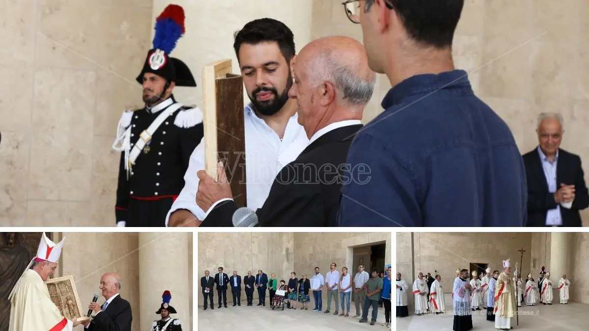 L’apertura al culto e alla preghiera della chiesa Cuore Immacolato di Maria Rifugio delle Anime di Paravati, fortemente voluta dalla serva di Dio Natuzza Evolo, ha rappresentato un giorno storico per la chiesa vibonese e calabrese. Un iter articolato, scaturito dall’apparizione della Madonna alla mistica, e concluso con l’immagine dell’apertura delle porte del sacro edificio ad opera del vescovo monsignor Attilio Nostro. Un momento che ha segnato la svota nel cammino di tanti fedeli che, da diverse località anche fuori regione, hanno fatto tappa nella cittadina del Vibonese. E tra gli attimi di fede più intensi vissuti sul sagrato della Chiesa, c’è stato il gesto – simbolico e d’alto impatto – della consegna al vescovo Nostro di una miniatura del portale da parte di Pasquale Anastasi, presidente della Fondazione “Cuore Immacolato di Maria Rifugio delle Anime. [Continua in basso]