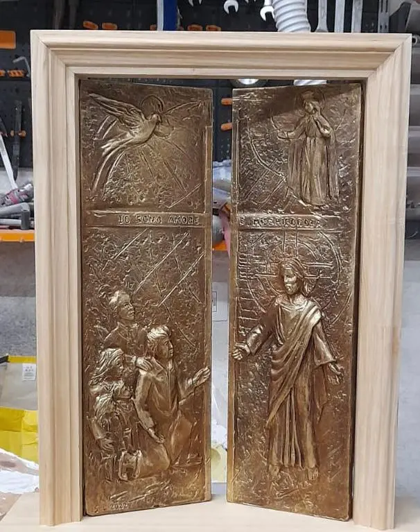 L’opera è stata realizzata da Pietro Colloca, giovanissimo e talentuoso artista originario dei Comuni di Cessaniti e Briatico, più dettagliatamente delle frazioni Favelloni e Potenzoni. Il professionista, che in passato si è distinto per la vasta quantità di opere a tema sacro confezionate (tra cui sculture di pregio), ha riprodotto fedelmente il bassorilievo sul portone, simbolo delle chiavi dell’edificio sacro. Si distingue nettamente l’immagine di Natuzza Evolo da un lato mentre dall’alto, Gesù Cristo con le braccia aperte. In alto, la Madonna avvolta nella luce e lo Spirito Santo. Il portale è aperto, in segno di universale accoglienza. “Io sono amore e misericordia” si legge. E il messaggio di Paravati non poteva essere più forte.