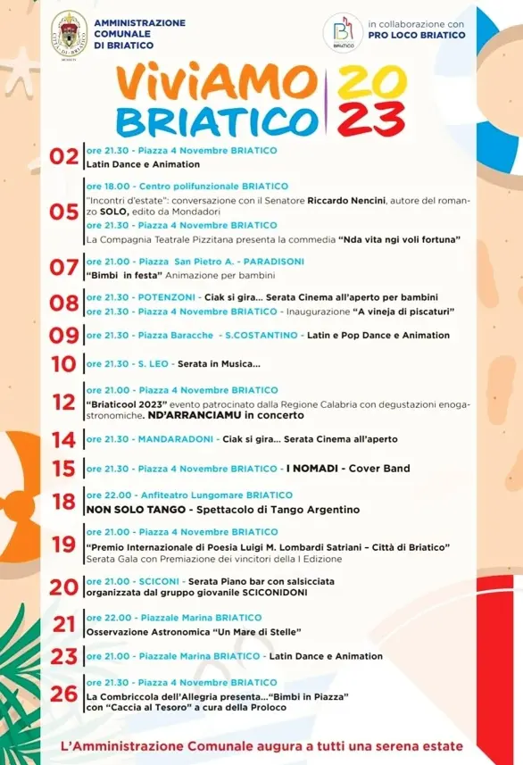 Dalla musica in piazza alle serate dedicate al cinema, all’osservazione astronomica, al teatro, al divertimento dei più piccoli. Al via il calendario eventi estivi stilato dall’amministrazione comunale di Briatico in collaborazione con la locale Pro loco. Gli eventi entreranno nel vivo a partire dalla giornata del 2 agosto e coinvolgono il centro costiero e le frazioni. Sia Briatico che i paesi limitrofi, durante la bella stagione, accolgono turisti ed emigrati. Da qui l’esigenza di andare incontro alle esigenze di un’utenza variegata. Gli appuntamenti iniziano stasera alle 21.30 con Latin dance e animazione in piazza 4 Novembre. Il 5 agosto, invece, spazio a “Incontri d’estate”, conversazione con il senatore Riccardo Nencini, autore del romanzo “Solo”, edito Mondadori. Il volume ricostruisce la vita di Giacomo Matteotti, fine intellettuale e fervente politico, in forma romanzesca ma partendo da una ricerca storica. L’evento si terrà al centro polifunzionale alle ore 18.00. Più tardi, alle 21.30 in piazza 4 Novembre la commedia “Nda vita ngi voli fortuna” della compagnia teatrale pizzitana. Il 7 agosto a Paradisoni “Bimbi in festa”. Mentre serate cinema all’aperto sono in programma l’8 agosto a Potenzoni e il 14 agosto a Mandaradoni (ore 21.30). Il gruppo gli Nd’Arranciamu animerà la serata del 12 agosto a Briatico, mentre il 15 agosto sarà la volta de I nomadi, cover band. Il 19 agosto si terrà la fase finale del Premio internazionale di poesia dedicato alla figura di Luigi Lombardi Satriani, già senatore della Repubblica e grande protagonista dello studio del Sud, il folclore e le tradizioni popolari, recentemente scomparso. Il 21 agosto, spazio all’osservazione astronomica con l’evento “Un mare di stelle”, ore 22.00 piazzale Marina a Briatico.