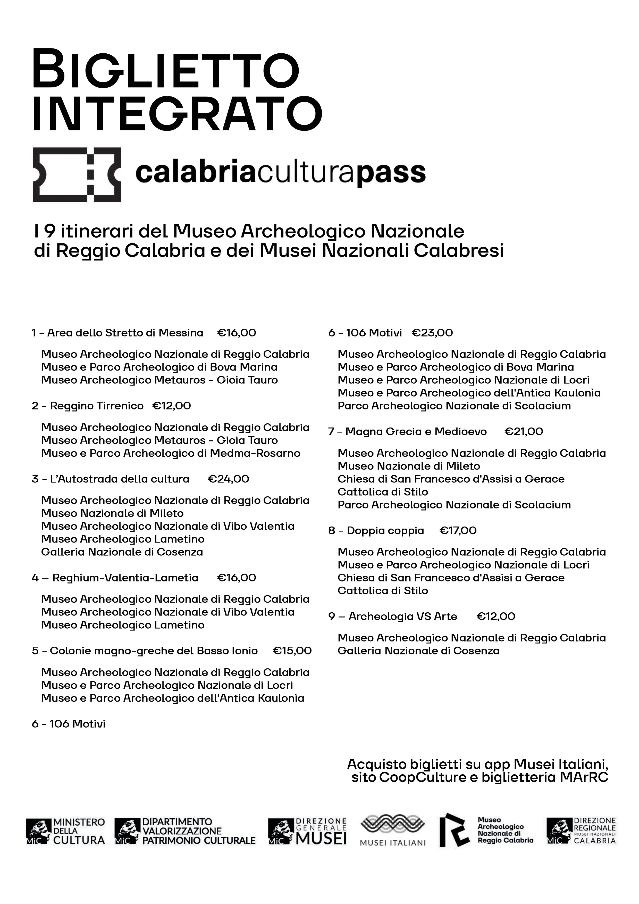 Il ticket unico nominativo è già attivo e può essere acquistato tramite app musei italiani, online, sul sito ufficiale CoopCulture o direttamente presso la biglietteria del Museo di Reggio Calabria. Dal primo accesso sarà valido nell’arco dei successivi sei mesi. Il Museo “Vito Capialbi” ha sede nel castello medievale di Vibo Valentia. Al suo interno è conservata una delle collezioni archeologiche più ricche e importanti della Calabria, che racconta ai visitatori la millenaria storia antica della città e del suo territorio, dall’età greca (Hipponion) a quella romana (Vibona Valentia) e medievale (Monsleonis). Per quanto riguarda il Museo di Mileto, esso è ospitato all’interno dell’ottocentesco palazzo vescovile. La collezione, disposta in due piani, abbraccia un arco temporale che va dall’età bizantina al XIX secolo. Nel primo sono conservati i pregiati marmi romani, riutilizzati nell’XI secolo da Ruggero D’Altavilla per decorare l’abbazia della Santissima Trinità, da lui fatta costruire nella città elevata a capitale della propria contea, poi abbandonata in conseguenza del terremoto che colpì la Calabria meridionale nel 1783. Al secondo sono esposti gli splendidi sarcofagi trecenteschi di Ruggero Sanseverino e Giovanna d’Aquino, feudatari di Mileto durante il regno angioino, i ricchi arredi sacri dell’antica cattedrale, le preziose immagini di culto e tra queste l’ineguagliabile crocefisso in avorio attribuito ad Alessandro Algardi.