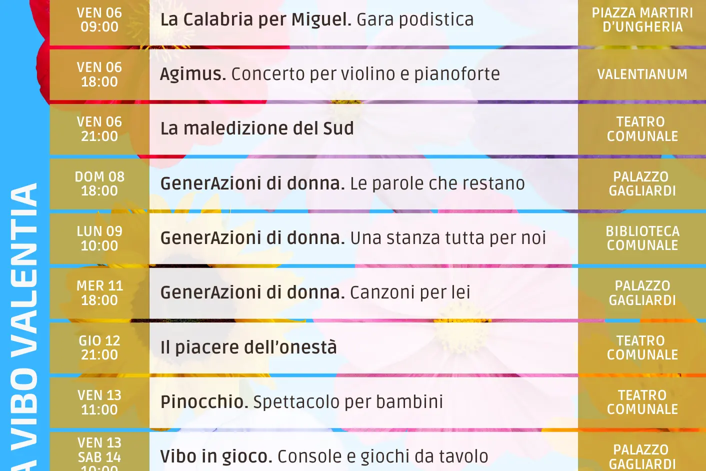 Si parte con la Corsa di Miguel, con 1500 studenti che popoleranno piazza Martiri d’Ungheria, per proseguire con un ciclo di quattro incontri dal tema “GenerAzioni di donna”, un percorso ampliato in quattro appuntamenti tra musica, arte e poesia dedicati all’universo femminile. Spazio ai ragazzi con “Vibo in Gioco”, due giornate a Palazzo Gagliardi tra console e giochi da tavolo. Per i più piccoli arriva “Pinocchio”, spettacolo gratuito per le scuole al Teatro Comunale, un modo concreto per avvicinare i bambini al teatro e renderlo un luogo familiare. Prosegue la stagione AMA con nuovi spettacoli di qualità, mentre i concerti Agimus portano al Valentianum recital e musica da camera. Tra gli appuntamenti sportivi spicca la prima Coppa Città di Vibo Valentia di dama italiana, insieme alla mostra “Carlo Acutis - Una semplicità straordinaria”, ospitata al Valentianum. E tantissimi altri appuntamenti.