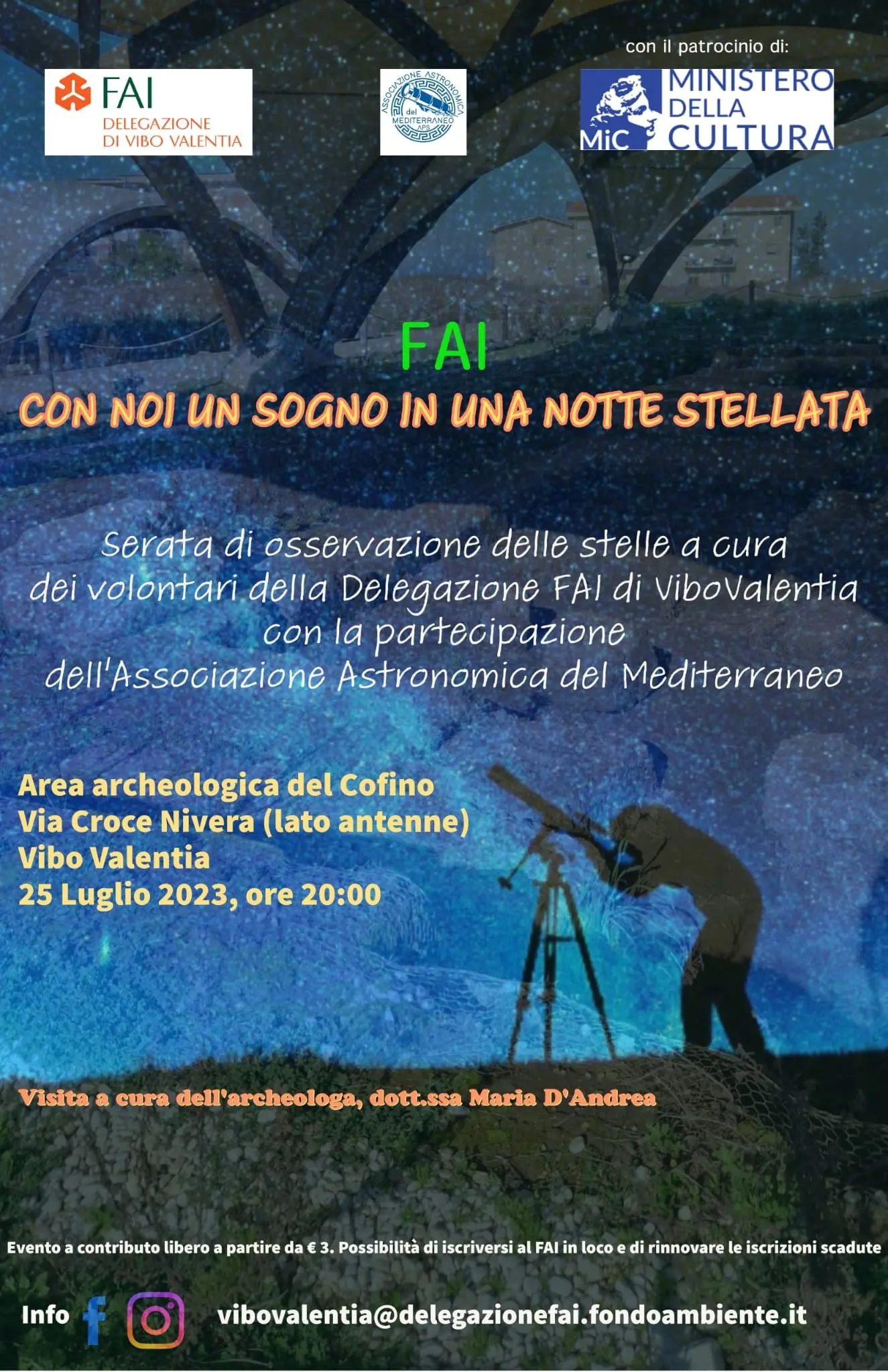 “Fai con noi un sogno in una notte stellata”. La delegazione vibonese del Fondo ambiente italiano promuove una iniziativa per valorizzare i siti d’interesse archeologico e al contempo osservazione della volta celeste. L’appuntamento si svolgerà martedì 25 luglio alle ore 20.00 presso l’area archeologica del Cofino (lato antenne). Si tratta di un evento molto atteso: «Le tradizioni – sottolineano i promotori- soprattutto se sempre di successo, vanno rispettate e proseguite e noi volontari Fai ce la mettiamo tutta per farlo». Questo è l’appuntamento estivo «per antonomasia da qualche anno, a cura della nostra delegazione e dell’Associazione astronomica del Mediterraneo». “Fai con noi un sogno in una notte stellata” si terrà lungo via Croce Nivera. Ad impreziosire la serata, la presenza dell’archeologa Maria D’Andrea che porterà i partecipanti «alla scoperta del magnifico sito, che ha «riportato alla luce tracce affascinanti del nostro glorioso passato in quella che è l’area sacra dedicata, per la presenza del basamento di un tempio, al mito di Kore/ Persefone».