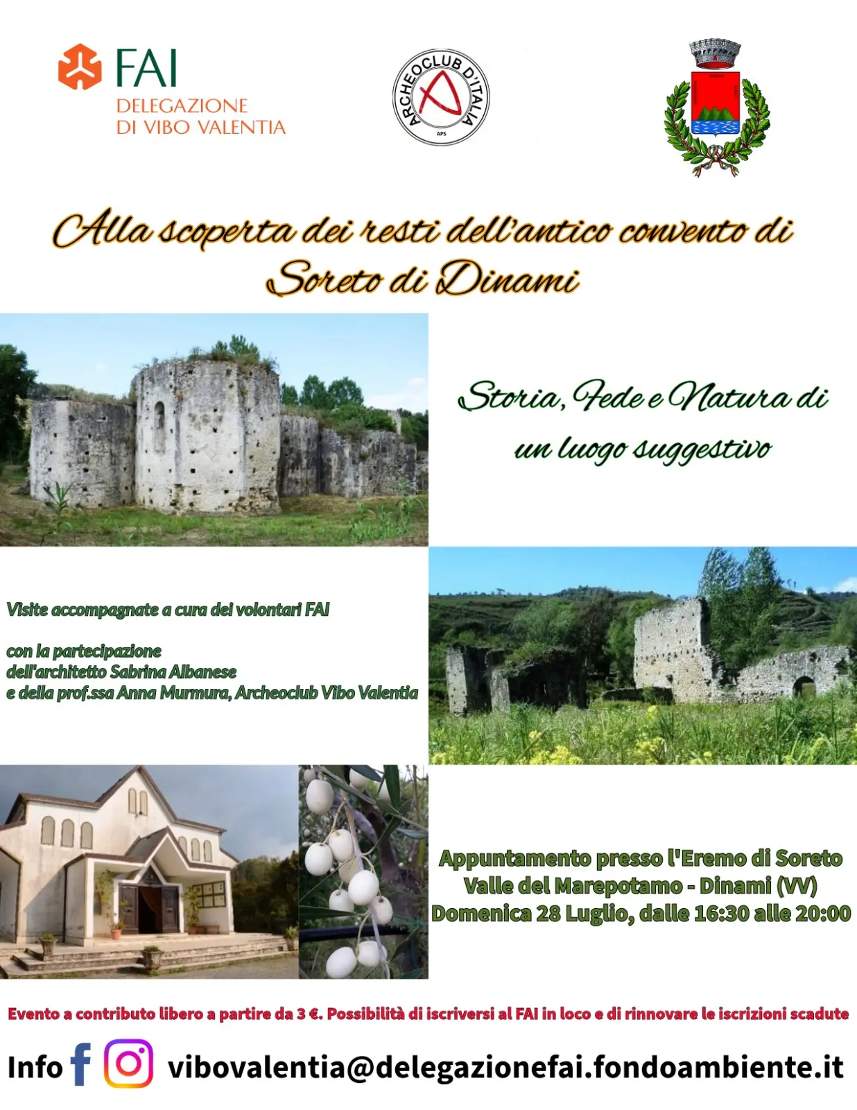 Un campo di ulivi bianchi, un eremo, una antica chiesetta impreziosita da opere d’arte. Questa l’incantevole cornice che ospiterà il terzo appuntamento organizzato dalla delegazione del Fai (Fondo ambiente italiano) di Vibo Valentia, previsto per domenica 28 luglio. A partire dalle 16:30, i volontari del ai accoglieranno i visitatori e li guideranno alla scoperta dell’antico sito religioso. Si tratta delle imponenti rovine del convento edificato nei pressi dell’antica città di Soreto a pochi chilometri dal paese di Dinami. La storia della costruzione del convento è avvolta da un alone di mistero. Si pensa, infatti, che il frate agostiniano, beato Francesco Marino di Zumpano, in provincia di Cosenza, avesse fatto edificare l’antico monastero, con l’aiuto dal conte Giancola Conclubeth di Arena.
