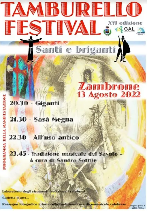 Infine, un progetto speciale: Tradizione musicale del Savuto pensato per il Tamburello festival e che sarà eseguito da Sandro Sottile autore musicale della nota Tarantella Aramonese dedicata proprio a Zambrone. Sicura la presenza dei Giganti Mata e Grifone. Filo conduttore della kermesse: Santi e briganti. L’evento s’incardina in una progettualità del Psr Calabria 2014/2020 Misura 19.3 curata dal Gal “Terre Vibonesi” presieduto da Vitaliano Papillo che ha accolto la richiesta d’inserimento della manifestazione radicata nel Comune costiero. Una collaborazione e un sostegno preziosi e decisivi sotto molteplici profili. L’evento sarà anche promosso dall’Amministrazione Comunale che ha affidato al sindaco Corrado L’Andolina un’articolata presentazione e riflessione sul tema festivaliero. L’evento, in via eccezionale, per quest’anno si svolgerà il 13 agosto.