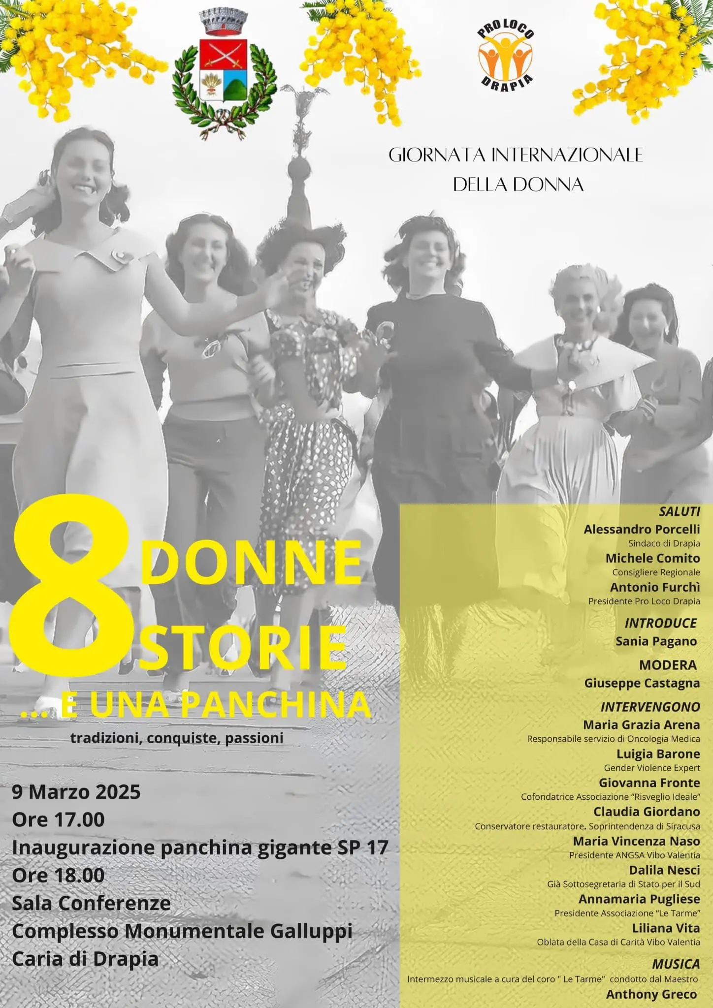 L’amministrazione comunale di Drapia si prepara a celebrare la Giornata internazionale della donna con un evento intitolato “8 donne, 8 strie …e una panchina”. L’appuntamento, in programma domenica 9 marzo, sarà un’occasione per riflettere sui progressi sociali, economici e politici compiuti dalle donne, senza dimenticare le discriminazioni e le sfide che ancora affrontano. La giornata prenderà il via alle ore 17 con l’inaugurazione di una panchina gigante lungo la Sp n. 17, un simbolo di resilienza e inclusione. Successivamente, alle 18, al complesso monumentale Galluppi di Caria, si terrà un incontro che darà voce a otto donne straordinarie. Ciascuna condividerà il proprio cammino fatto di passione, determinazione e traguardi raggiunti.