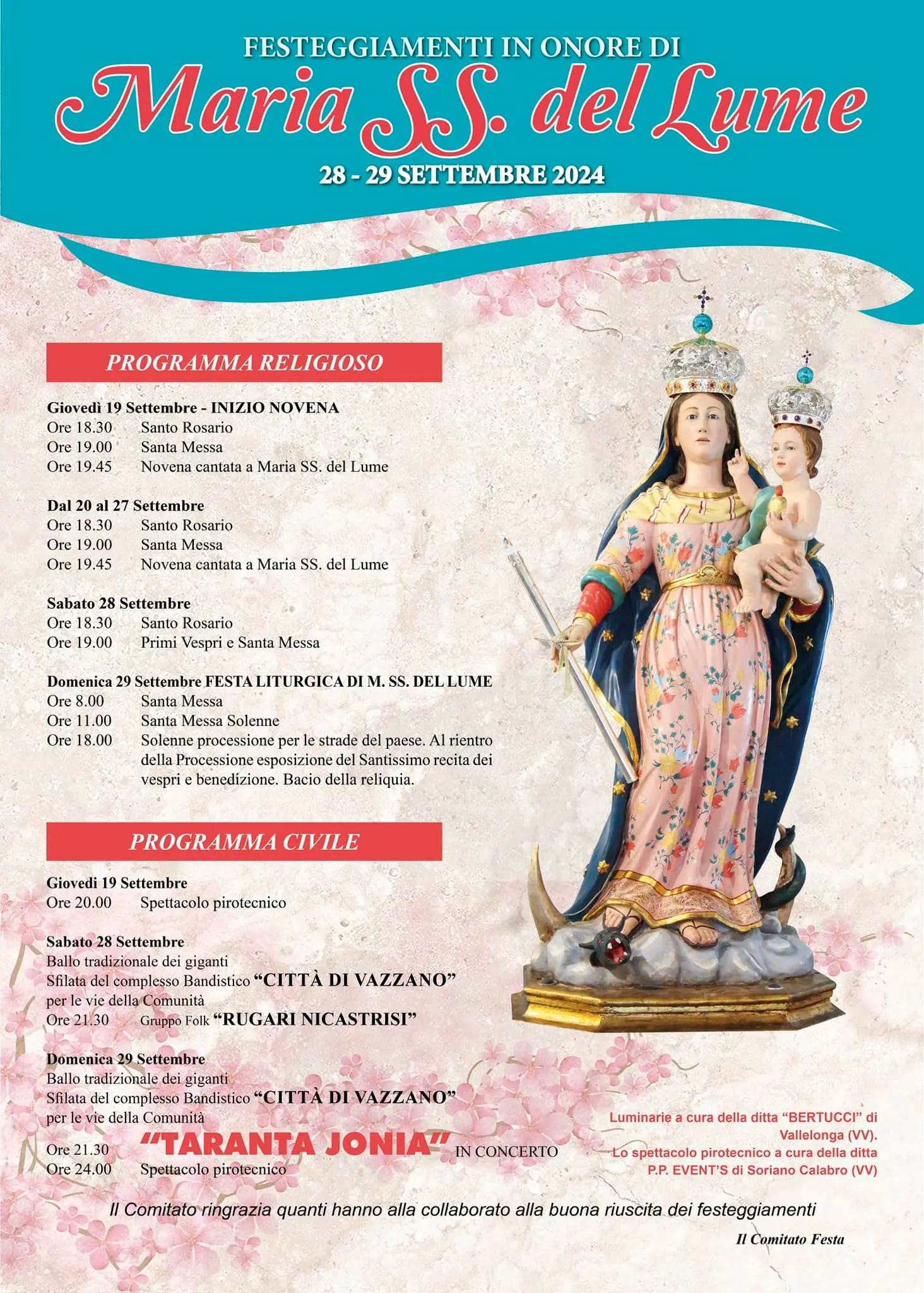 Il programma religioso prevede per tutte le sere messa e novena dalle ore 19.00. Per il giorno di festa, il 29 settembre, celebrazioni eucaristiche alle ore 8.00 e 11.00. In serata alle 18.00 processione per le vie del paese. Per quanto riguarda i festeggiamenti civili, sabato 28 settembre, alle ore 21.30 esibizione del gruppo folk Rugari nicastrisi. Domenica 29 settembre, alle 21.30, i Taranta jonica in concerto. In chiusura, alle 24.00 spettacolo pirotecnico. Ad allietare le giornate di festa il ballo dei giganti e la banda Città