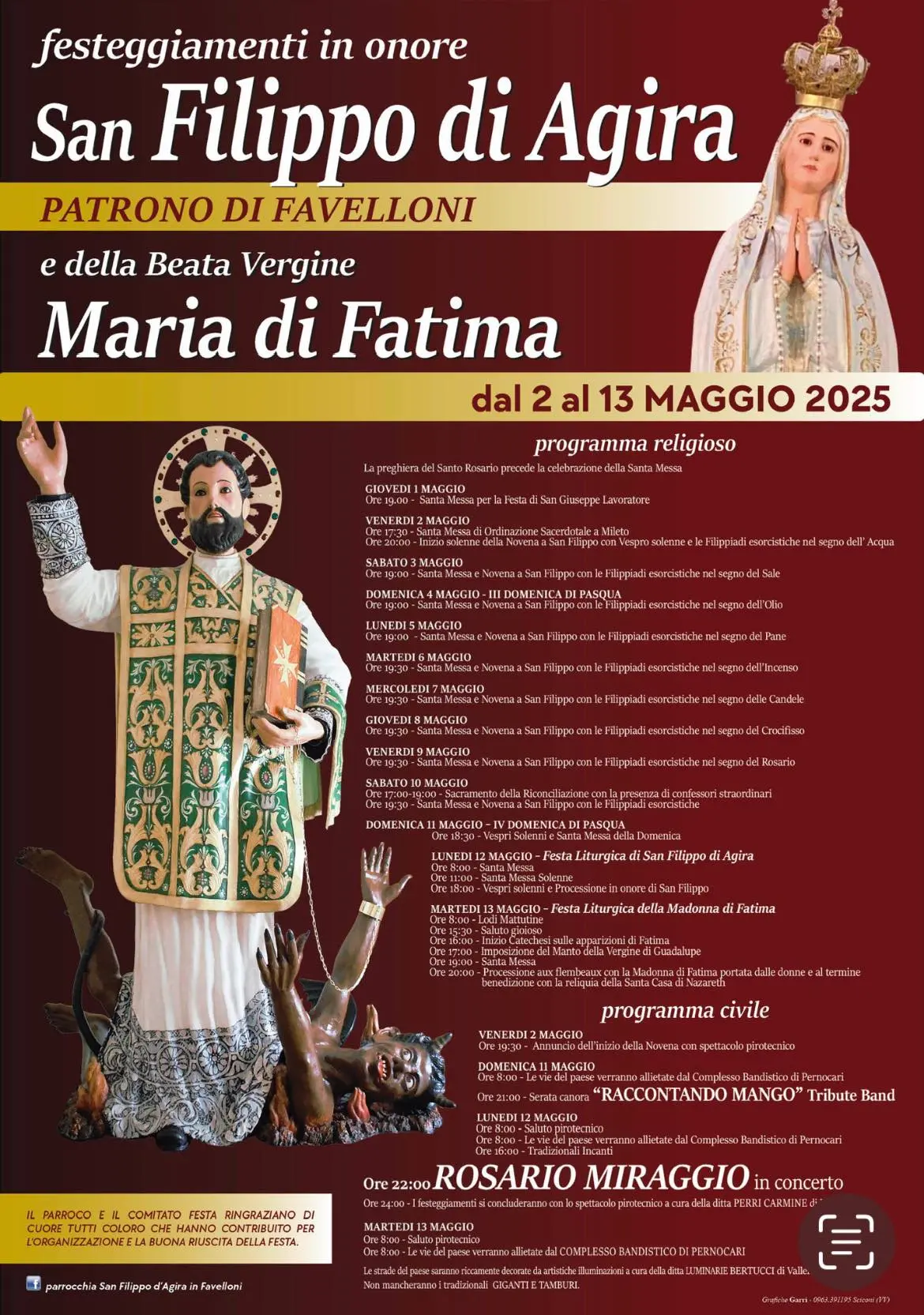 È una festa religiosa particolarmente sentita che richiama fedeli dai paesi limitrofi e segna al contempo il ritorno di molti emigrati. A Favelloni, frazione di Cessaniti, tutto pronto per i festeggiamenti in onore del compatrono San Filippo d’Agira che si tengono tradizionalmente l’11 e 12 maggio. Il giorno successivo, il 13 maggio, il piccolo centro omaggia invece la Madonna di Fatima. La venerazione nei confronti del Santo venuto dall’Oriente ha radici antiche e si sarebbe diffusa grazie all’influenza dei monaci. San Filippo lega Favelloni a diverse altre località come Agira (Enna), Piazza Armerina, Limina, Isola di Malta, Calatabiano (Sicilia), accomunate dalla venerazione al santo venuto dall’Oriente.