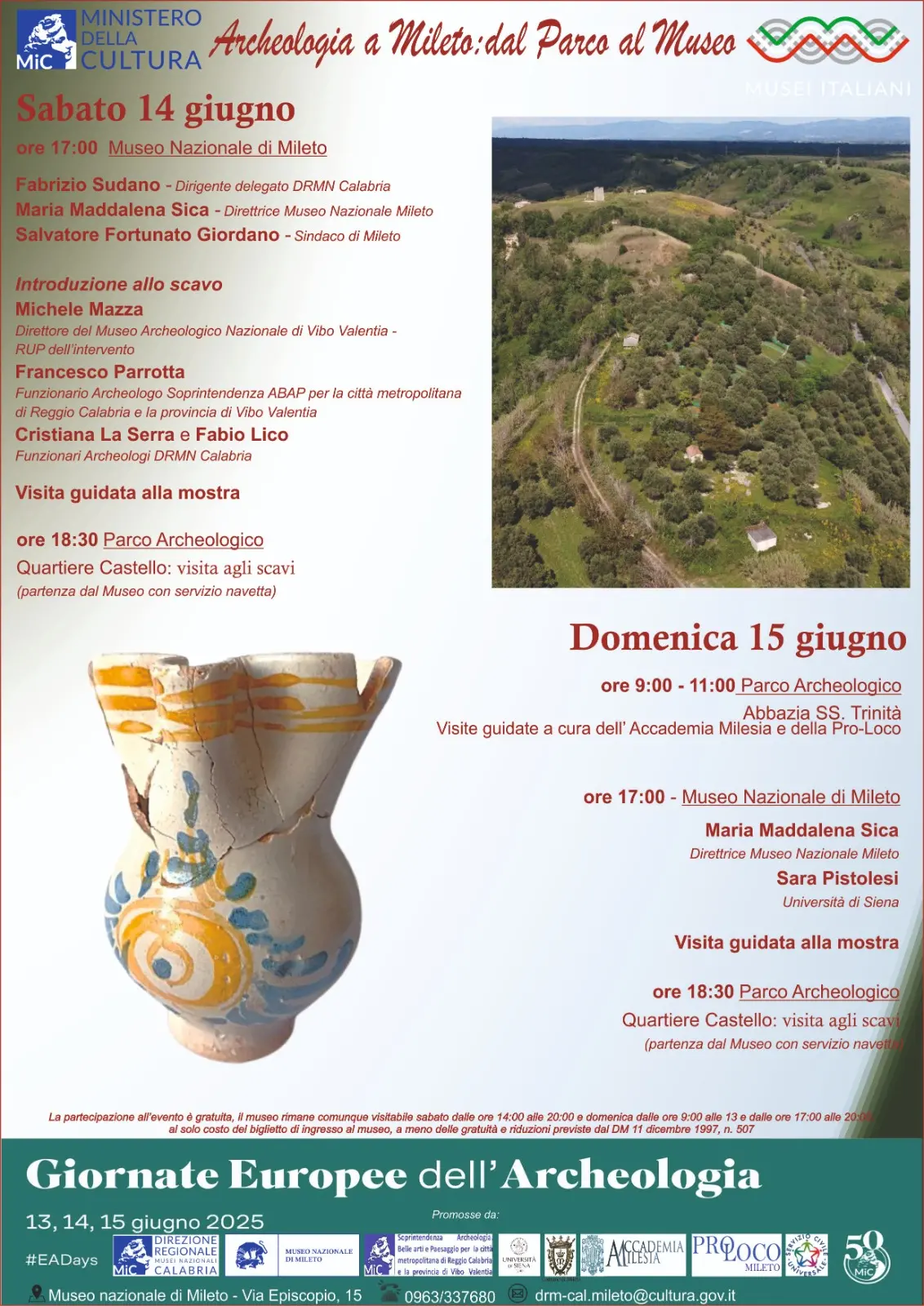 La direttrice del Museo, Maria Maddalena Sica, spiega i motivi che l’hanno spinta alla promozione di questa importante iniziativa: «L’obiettivo di queste giornate europee dell’archeologia è quello di presentare le novità in campo archeologico e sensibilizzare i cittadini sull’importanza della ricerca. Si presenterà una selezione dei materiali emersi durante la recente campagna di scavi offerta come anticipazione di quelli che saranno altri appuntamenti con la ricerca, lo studio e le scoperte del territorio miletese. Le azioni messe in campo in queste giornate dal Museo di Mileto in collaborazione con la Soprintendenza, il Comune di Mileto e l’Università di Siena, nonché il supporto delle associazioni e dei cittadini, rappresentano un momento fondamentale di cooperazione tra gli enti finalizzato alla ricerca, alla conoscenza e di conseguenza alla promozione e valorizzazione del territorio».