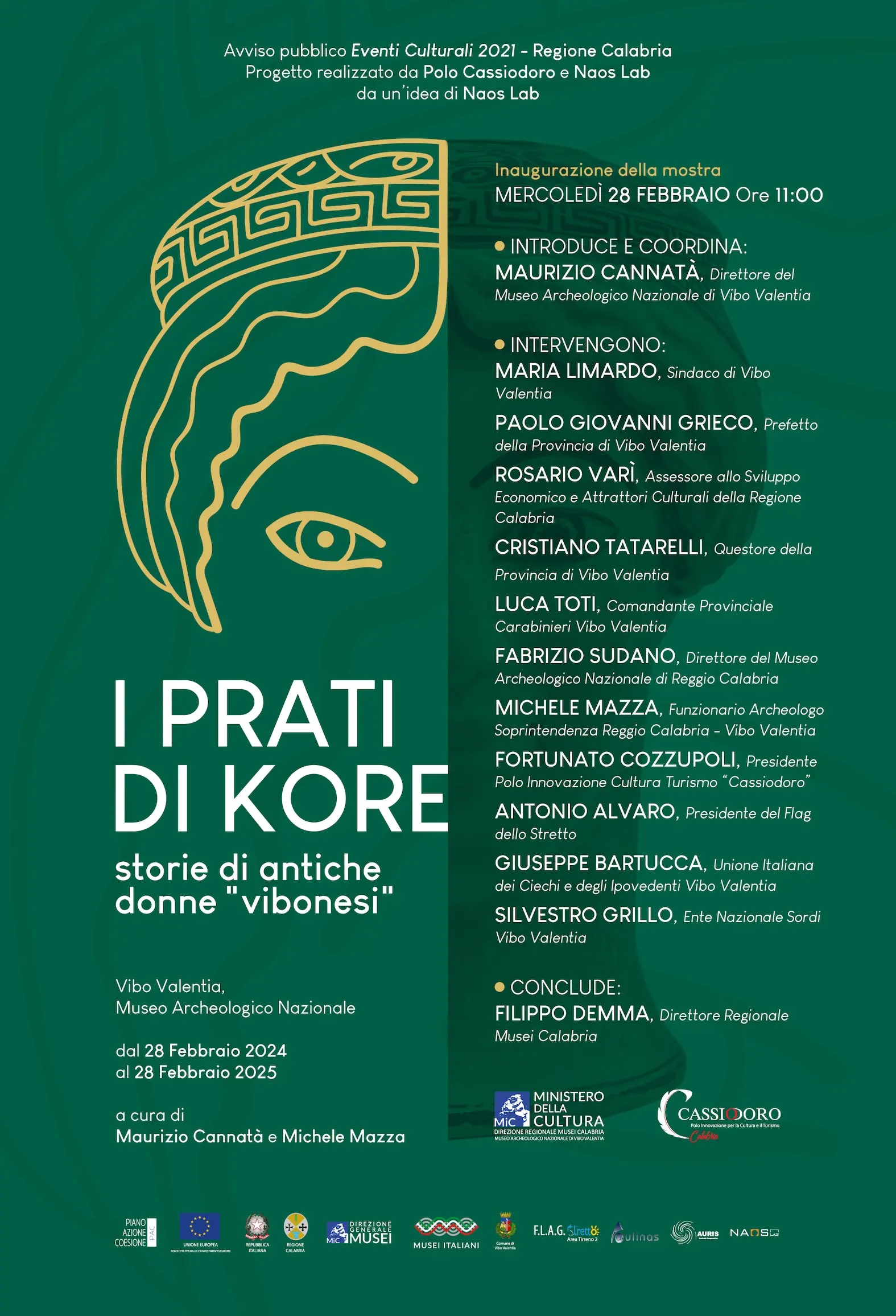 È tutto pronto per l’inaugurazione della mostra “I Prati di Kore. Storie di antiche donne «vibonesi»” che inizierà domani, mercoledì 28 febbraio, alle ore 11:00. Introdurrà e coordinerà i lavori Maurizio Cannatà, direttore del Museo archeologico nazionale di Vibo Valentia. Previsti gli interventi di: Maria Limardo, sindaco di Vibo Valentia; Paolo Giovanni Grieco, prefetto di Vibo Valentia; Rosario Varì, assessore allo Sviluppo Economico e Attrattori Culturali della Regione Calabria; Cristiano Tatarelli, questore di Vibo Valentia; Luca Toti, comandante provinciale dei carabinieri di Vibo Valentia; Fabrizio Sudano, direttore del Museo Archeologico Nazionale di Reggio Calabria; Michele Mazza, funzionario archeologo Soprintendenza Reggio Calabria-Vibo Valentia; Fortunato Cozzupoli, presidente Polo Innovazione Cultura Turismo “Cassiodoro”; Antonio Alvaro, presidente del Flag dello Stretto; Giuseppe Bartucca, Unione Italiana dei Ciechi e degli Ipovedenti Vibo Valentia; Silvestro Grillo, ente nazionale sordi Vibo Valentia. A concludere i lavori sarà Filippo Demma, direttore regionale Musei Calabria.