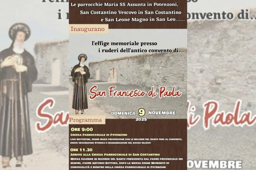 Il programma prevede per il 9 novembre alle 9.00, nella chiesa parrocchiale di Potenzoni, lodi mattutine. A seguire inizio della processione con le reliquie del Santo fino al Convento. Breve descrizione storica e inaugurazione del basso rilievo. Alle 11.00, arrivo nella Chiesa parrocchiale di San Costantino: messa solenne presieduta da padre Bottino. In conclusione della giornata momento di convivialità e rientro nella chiesa parrocchiale di Potenzoni.