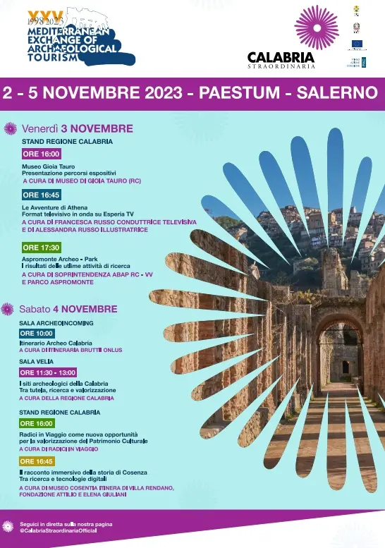 Dal 2 al 5 novembre 2023 la Regione Calabria parteciperà alla XXV edizione della Borsa Mediterranea del turismo archeologico di Paestum, evento internazionale volto a promuovere il patrimonio culturale e le destinazioni turistico-archeologiche che vedrà la partecipazione di 150 espositori tra istituzioni, Paesi esteri, Regioni, Province, Comuni, Camere di commercio, Aziende di promozione turistica, Soprintendenze, Parchi archeologici, organizzazioni di categoria, associazioni culturali e professionali, consorzi e imprese turistiche, società di servizi e case editrici. Fitto il calendario di conferenze, incontri e presentazioni di importanti progetti promossi dal Dipartimento turismo della Regione nelle varie sale del “Tabacchificio Cafasso” a pochi passi dal meraviglioso parco archeologico e presso lo stand dove saranno, anche, disponibili pubblicazioni e materiale informativo, contenuti multimediali proiettati su supporti digitali. Si inizia venerdì 3 novembre alle ore 16 presso lo stand della regione dove il Museo Gioia Tauro (Reggio Calabria) con la direttrice Simona Bruni e l’archeologa Stefania Mancuso presenteranno i percorsi espositivi del museo; a seguire alle 16:45 il format televisivo di Esperia TV “Le Avventure di Athena” con la conduttrice televisiva Francesca Russo, l’illustratrice Alessandra Russo e l’ archeologa Mariangela Preta; alle 17:30 Aspromonte Archeo- Park : i risultati delle ultime attività di ricerca che vedrà l’introduzione di Fabrizio Sudano (soprintendente Sabap di Reggio-Vibo), Andrea Gennaro funzionario archeologo, l’archeologa Sara Marino, Giuseppe Putortì direttore del parco Aspromonte, il professore Daniele Castrizio e l’archeologo Riccardo Consoli. Sabato 4 novembre alle ore 10 nella sala Archeoincoming presentazione di “Itinerari archeo Calabria” a cura di Itineraria Bruttii Onlus con l’archeologo e presidente Paolo Gallo e l’archeologa Mariangela Preta, a seguire presso la sala Velia dalle ore 11:30 alle 13:00 sarà presentata la conferenza “I siti archeologici della Calabria tra tutela ricerca e valorizzazione” a cura della regione Calabria in cui interverranno Cosimo Caridi dirigente dipartimento turismo, Fabrizio Sudano soprintendete Sabap di Reggio e Vibo, l’archeologa Stefania Mancuso e la direttrice del Polo Museale di Soriano Calabro Mariangela Preta. Nel pomeriggio proseguiranno gli appuntamenti nello stand della regione Calabria dove alle 16 sarà presentato il progetto “Radici in Viaggio” come nuova opportunità per la valorizzazione del patrimonio culturale a cura di Radici In Viaggio con la partecipazione di Serena Franco, Francesco Biacca, Nunzia Calderazzo, Elsa Calderazzo, Donatella Calderazzo e Pasquale La Gamba; alle 16:45 Il racconto immersivo della storia di Cosenza tra ricerca e tecnologie digitali a cura del Museo Consentia Itinera di Villa Rendano, Fondazione Attilio e Elena Giuliani con la Storica dell’arte Anna Cipparrone e l’archeologa Mariangela Preta. La presenza alla Borsa di Paestum sarà un modo per presentare un’immagine diversa della Calabria, quella ricca di patrimoni artistici, rappresentante di un turismo culturale e archeologico, oltre che paesaggistico. La partecipazione a questo salone espositivo internazionale rappresenterà un modo per rendere attrattiva la nostra regione, favorendo contatti con altri territori, sostenendo le visite e incentivando tour nella nostra terra, culla della Magna Grecia e di radici millenarie.