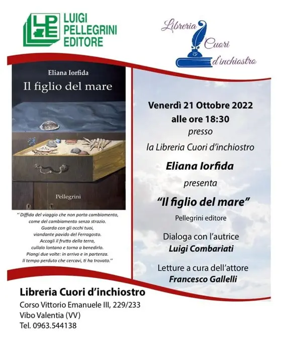 La libreria “Cuori d’inchiostro”, presente a Vibo Valentia in Corso Vittorio Emanuele III, ospiterà al presentazione di una nuova opera letteraria. Alle ore 18:30 di venerdì 21 ottobre, sarà illustrato il libro dal titolo “Il figlio del mare”, scritto dall’autrice Eliana Iorfida ed edito dalla casa editrice “Luigi Pellegrini Editore”. In occasione della presentazione, dialogherà con l’autrice Luigi Combariati. All’evento sarà presente anche l’attore Francesco Gallelli che, per l’occasione, leggerà alcuni estratti del libro. [Continua in basso]