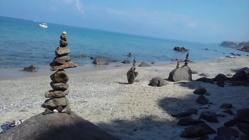 Raffaele Massaria è di Vibo Marina, ha 50 anni, una vita familiare tormentata condivisa con le sue sorelle, lavori saltuari come idraulico e una depressione che lo stava spegnendo. «È stata la spiaggia di Timpa Janca a salvarmi – dice nascondendo gli occhi -, è stato questo posto a scacciare i fantasmi che mi portavo dentro». Qui è entrato in sintonia con la natura e passa gran parte delle sue giornate, in estate e in inverno, realizzando suggestive sculture di sassi che chiama totem. Chiunque abbia avuto l’idea e la voglia di esplorare questo spicchio di costa molto difficile da raggiungere, si è imbattuto nelle sue creazioni.