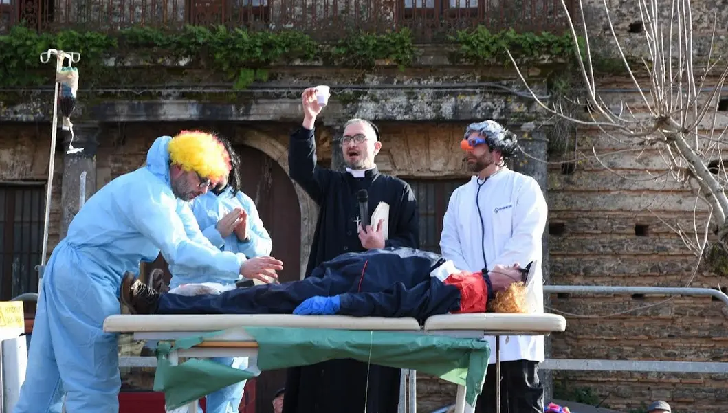Accompagnato dalla moglie “corajisima” (raffigurante la quaresima) giunge in barella presso la piazza del paese ove su un palco allestito per l’occasione si procede ad un intervento chirurgico effettuato da un medico strampalato coadiuvato da due infermieri. Il trio, alternando sorsi di vino e morsi a crocchette di carne alla falsa operazione medica, procede ad estrarre le interiora del povero Carnevale (rappresentante con delle salsicce) e a prelevarne il sangue (magicamente tramutatosi in vino). All’esito dell’intervento, il medico pronuncia la storica frase: «L’operazione è riuscita, il paziente è morto».