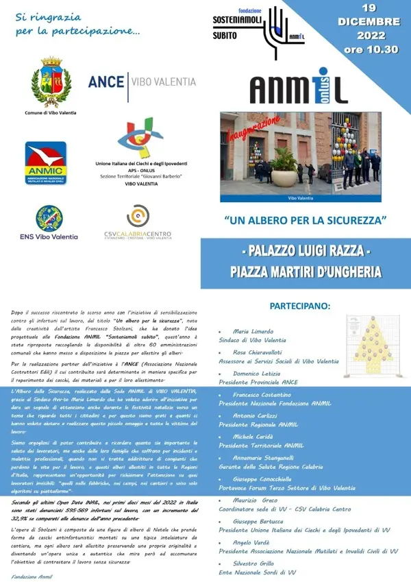 Viene chiamato “l’albero della sicurezza” e punta a sensibilizzare la comunità sul triste fenomeno degli incidenti nei luoghi di lavoro. L’idea è frutto della creatività dell’artista Francesco Sbolzani che l’ha donata alla fondazione Anmil. Partner dell’iniziativa è l’Ance, associazione nazionale costruttori edili. Nella cittadina, l’albero della sicurezza viene realizzato dalla sede locale Anmil ed è stato fortemente voluto dal sindaco Maria Limardo che ha voluto aderire all’iniziativa «per dare un segnale di attenzione anche durante le festività natalizie». Un modo per omaggiare le vittime del lavoro, per esprimere vicinanza alle famiglie private prematuramente di un proprio caro. Ma non solo, anche gli incidenti o malattie professionali contribuiscono a cambiare, a volte per sempre, la situazione di interi nuclei familiari. [Continua in basso]