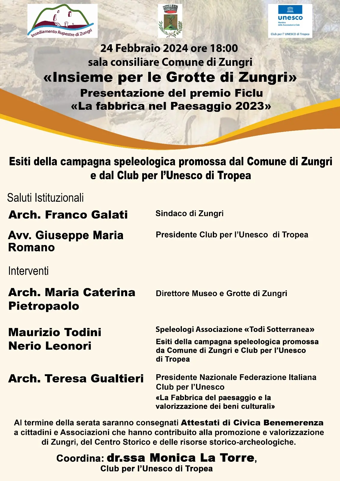 “Insieme per le grotte di Zungri” è il tema dell’appuntamento in programma nella sala consiliare del Comune di Zungri. Nell’ambito dell’evento si terrà la presentazione del premio Ficlu, “La fabbrica nel paesaggio 2023” e degli esiti della campagna speleologica promossa dall’ente e dal club Unesco di Tropea. La ricognizione speleologica, lo studio e la ricerca di attività artificiali oltre a quelle ormai note e parte integrante dell’Insediamento rupestre, si sta concentrano lungo il costone del torrente Murria, in località “Fossi”. L’obiettivo è quello di evidenziale eventuali emergenze di tipo archeologico e comunque ottenere una restituzione cartografica delle cavità e di altre strutture legate al sito rupestre. La campagna si concluderà ufficialmente il 27 febbraio. I primi risultati verranno illustrati nell’ambito dell’iniziativa in programma domani dalle ore 18.00. Zungri, grazie alla promozione delle grotte, in questi ultimi anni ha richiamato la presenza di considerevoli gruppi di turisti. Ma non solo. Le iniziative promosse per la valorizzazione del centro storico, abbellito con le opere d’arte sui portoni antichi e l’area dedicata ai proverbi e detti calabresi, hanno offerto uno spunto in più. Tanti visitatori, dopo aver fatto tappa all’Insediamento rupestre, hanno scelto di ritornare per conoscere anche il paese. Un risultato per nulla scontato. Così come il trionfo nell’ambito del concorso internazionale Unesco “La fabbrica del paesaggio”, contest di progettazione urbanistica e riqualificazione paesaggistica promosso dalla Federazione italiana dei club Unesco. Questo e molto altro saranno al centro dell’appuntamento. Ai saluti del sindaco di Zungri, Franco Galati e del presidente club Unesco Tropea, Giuseppe Maria Romano, seguiranno gli interventi del direttore del Museo e grotte di Zungri, Maria Caterina Pietropaolo; Maurizio Todini e Nerio Leonori, speleologi dell’associazione Todi sotterranea. Quindi i contributi di Teresa Gualtieri, presidente nazionale federazione italiana club per l’Unesco. Al termine della serata saranno consegnati gli attestati di civica benemerenza a cittadini e associazioni che hanno contributo alla promozione di Zungri. Coordina, Monica La Torre del club per l’Unesco Tropea.