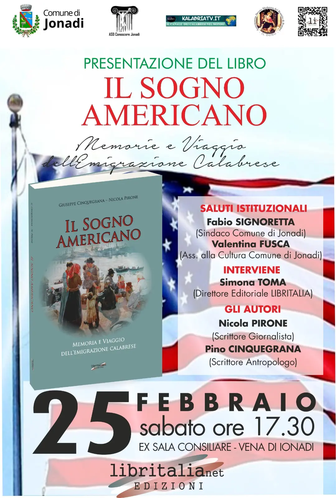 Sbarca anche a Ionadi “Il Sogno Americano” dell’antropologo Giuseppe Cinquegrana e del giornalista Nicola Pirone. Domani 25 febbraio, con inizio alle 17.30, il libro scritto a quattro mani sarà presentato nell’ex sala consiliare situata nella frazione Vena, nei pressi del bivio del campo di aviazione. Il volume, edito da Libritalia, nelle sue 178 pagine racconta la storia dell’emigrazione calabrese, vista come una forma di riscatto sociale dopo le promesse disattese, successive all’unità dell’Italia. Fra le righe, tra l’altro, emergono le difficoltà affrontate, in quel contesto, dalla maggioranza degli emigranti calabresi, soprattutto a inizio Novecento e alla fine della Seconda guerra mondiale. Il libro propone anche numerosi reperti, foto e documenti del periodo. L’incontro in programma nella giornata di domani a Ionadi, oltre a permettere di focalizzare l’attenzione sulla valenza e sui contenuti de “Il Sogno Americano” all’epoca accarezzato da migliaia di calabresi, rappresenta un’iniziativa utile per approfondire la tematica dell’emigrazione e per riflettere e trarre spunti anche sull’attuale contesto sociale, culturale ed economico, con tantissimi giovani che si ritrovano costretti a lasciare il proprio territorio di nascita e a emigrare in nord Italia e all’estero per motivi di studio o di lavoro. [Continua in basso]