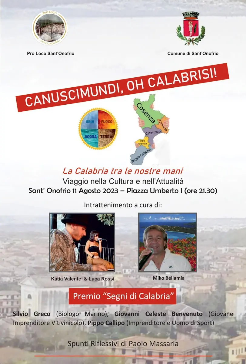 Tanto l’Oriente quanto l’Occidente hanno concepito, da secoli, la stretta connessione tra l’uomo e la natura, dall’equilibrio dei cui elementi dipendeva e dipende la vita della specie umana e la sopravvivenza del cosmo. Acqua, aria, terra e fuoco saranno i temi di fondo dell’edizione 2023 di “Canuscimundi, oh Calabrisi”, che – svolgendosi nella serata dell’11 agosto – diverrà occasione di intrattenimento ed excursus tra passato, presente e futuro, per uscire da un’immagine rassegnata e stereotipata della Calabria attraverso le testimonianze di: Silvio Greco (biologo marino), per “parlare della fondamentale salute dell’acqua e dell’ambiente”; Giovanni Benvenuto (imprenditore vitivinicolo), “tornato alla terra per esaltarne l’essenza”; Pippo Callipo (imprenditore), la cui azione quotidiana trasuda “il fuoco della passione”. A costoro andrà il Premio “Segni di Calabria”, per l’impegno profuso in ciascun ambito. La manifestazione, coordinata da Paolo Massaria – che curerà anche “brevi appunti di viaggio”, verrà animata da: Katia Valente e Luca Rossi (ritmi internazionali per cantare una Calabria proiettata nel Futuro); Miko Bellamia (sonorità e simpatiche forme canore, intrise di tipica e nuova calabresità). Appuntamento in piazza Umberto I a Sant’Onofrio dalle ore 21.30.
