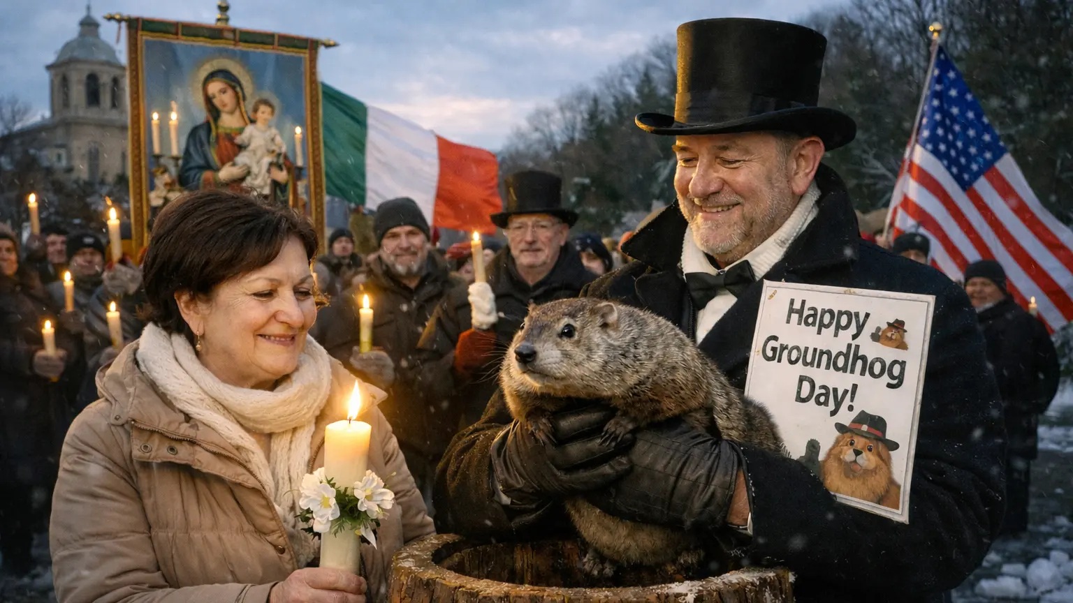 A migliaia di chilometri di distanza, sempre il 2 febbraio, negli Stati Uniti si celebra il Groundhog Day, il Giorno della Marmotta, che richiama le credenze legate alla fine delal stagione fredda. Nella cittadina di Punxsutawney, una marmotta “interroga” l’inverno: se uscendo dalla tana vede la propria ombra (quindi c’è il sole), il freddo durerà ancora; se non la vede, la primavera è vicina. Una tradizione divenuta spettacolo mediatico, ma che affonda le sue radici in usanze europee legate proprio alla Candelora.