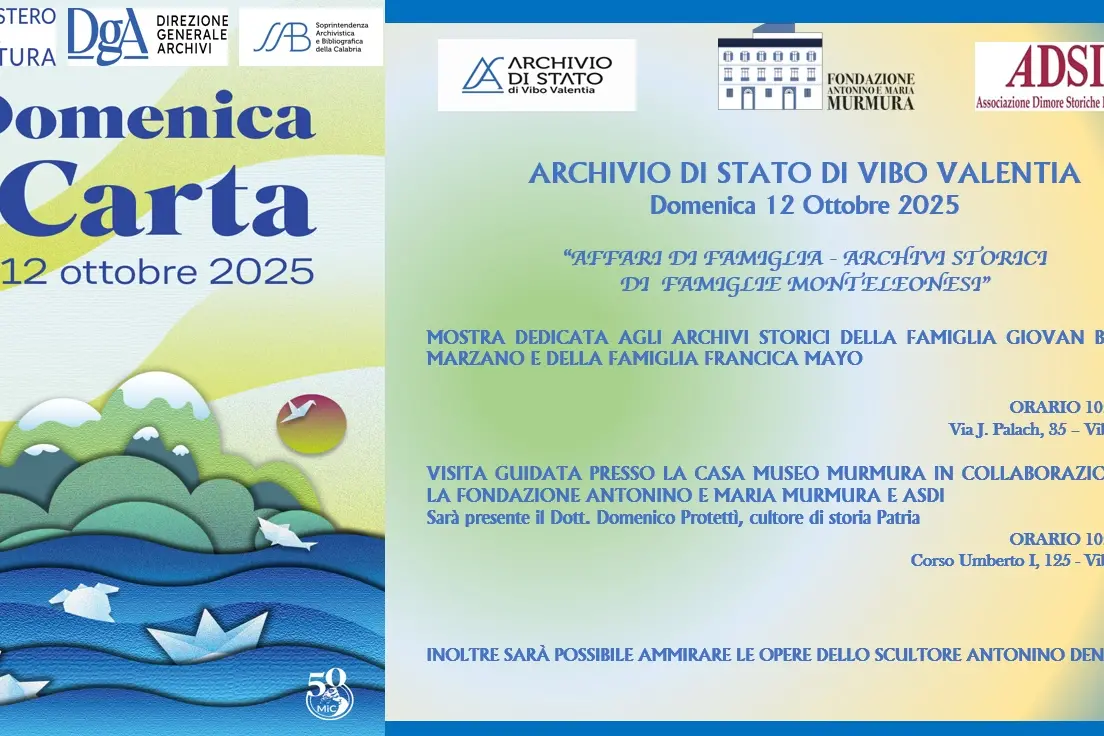 Domenica 12 ottobre 2025 torna l’appuntamento con La Domenica di Carta, che rappresenta un'importante occasione per aprire gli Istituti archivistici alla cittadinanza, valorizzando il patrimonio documentario attraverso eventi culturali, esposizioni e attività di carattere divulgativo.