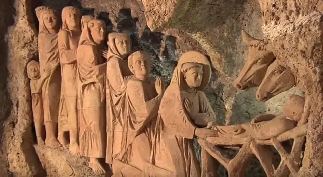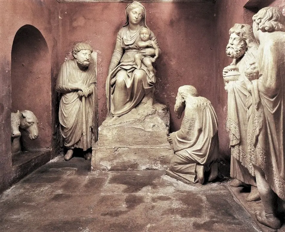 La rappresentazione della Natività di Cristo ha origini antiche, il momento della nascita del Messia ha avuto sempre una grande importanza e un elevato valore simbolico per la comunità Cristiana, poiché rappresenta la venuta del Salvatore e la possibilità di redenzione per l’intera umanità. Già nelle Catacombe di epoca romana, quando i primi Cristiani erano costretti a professare la loro fede religiosa in clandestinità a causa delle persecuzioni, è possibile ritrovare esempi raffigurativi della Natività, semplici immagini di Maria che tiene in grembo il Bambin Gesù. Successivamente, con la libertà di professare liberamente la fede Cristiana, grazie all’Editto di Galerio che nel 311 d.C. poneva fine alle persecuzioni e soprattutto all’Editto di Costantino che due anni dopo sanciva nuovamente la libertà di culto anche per i cristiani, le chiese furono presto decorate con scene della Natività di Cristo. Intorno al XII secolo fu poi la volta delle prime rappresentazioni scultoree e nel 1223 San Francesco diede vita al primo Presepe vivente della storia. Il Santo si era recato nel 1220 in pellegrinaggio in Palestina per visitare i luoghi sacri inerenti alla vita di Gesù, era rimasto particolarmente colpito da Betlemme e tornato in patria iniziò a pensare ad una rappresentazione della nascita di Gesù. Spinto da questo desiderio chiese a Papa Onorio III il permesso di poter dar vita a tale rappresentazione, il Pontefice acconsentì alla richiesta di Francesco con la sola obiezione di non portare in scena la Natività in chiesa, poiché le regole di quel tempo non lo permettevano. San Francesco riprodusse allora la sua idea all’aperto, a Greccio, un paesino vicino a Rieti. Fu approntata una mangiatoia con della paglia in una grotta mentre alcuni frati si occupavano di illuminare la scena con alcune torce. Curioso è il fatto che sebbene questo sia considerato il primo Presepe vivente, in questa rappresentazione non vi erano né la Vergine Maria né San Giuseppe.