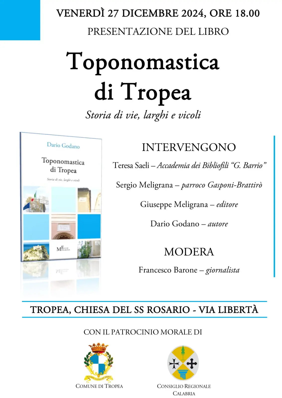 Venerdì 27 dicembre alle ore 18 nella chiesa del Santissimo Rosario di Tropea si terrà la presentazione del libro di Dario Godano dal titolo “Toponomastica di Tropea – Storia di vie, larghi e vicoli” edito da Meligrana Editore. L’opera di Godano vuole «offrire un viaggio avvincente attraverso la storia, la cultura e l’identità della città tirrenica. Con il suo patrimonio urbanistico e architettonico – ha fatto sapere l’autore in una nota stampa -, Tropea è uno scrigno millenario di storie e significati racchiusi nei nomi delle sue vie, viali, larghi, piazze, affacci panoramici e dei suoi vicoli caratteristici: le “vinee” (viuzze)». Il lettore potrà «esplorare l’origine e l’evoluzione dei toponimi di Tropea, riconoscendo le tracce delle civiltà che l’hanno abitata e influenzata nel corso dei secoli. Attraverso un’analisi approfondita, arricchita da aneddoti e testimonianze, sarà così guidato in un percorso che tenderà a svelare gradualmente il legame indissolubile tra i nomi e le storie che questi custodiscono». Inoltre, si potrà «scoprire come la toponomastica tropeana non sia solo una questione di designazioni stradali, ma un vero e proprio racconto di una eredità civica che parla di tradizioni, leggende e identità collettiva».