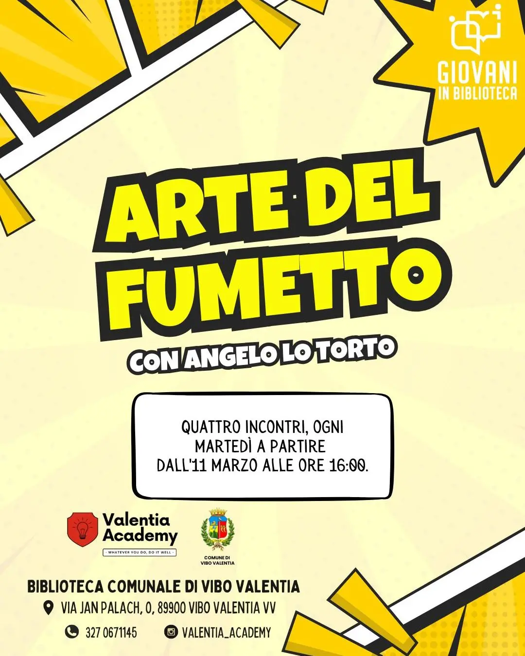 Al via il corso formativo dedicato all’arte del fumetto. L’iniziativa prevede quattro incontri nelle giornate di martedì all’interno dei locali della Biblioteca comunale di Vibo Valentia. Si partirà martedì 11 marzo. La struttura lungo via Jan Palach, infatti, accoglierà quanti desiderano creare storie e scoprire come nasce un albo illustrato. Si tratta, spiega il Comune attraverso la pagina Facebook, di «un viaggio creativo in cui potrai vestire i panni di sceneggiatore e disegnatore, vivendo l’intero processo editoriale».