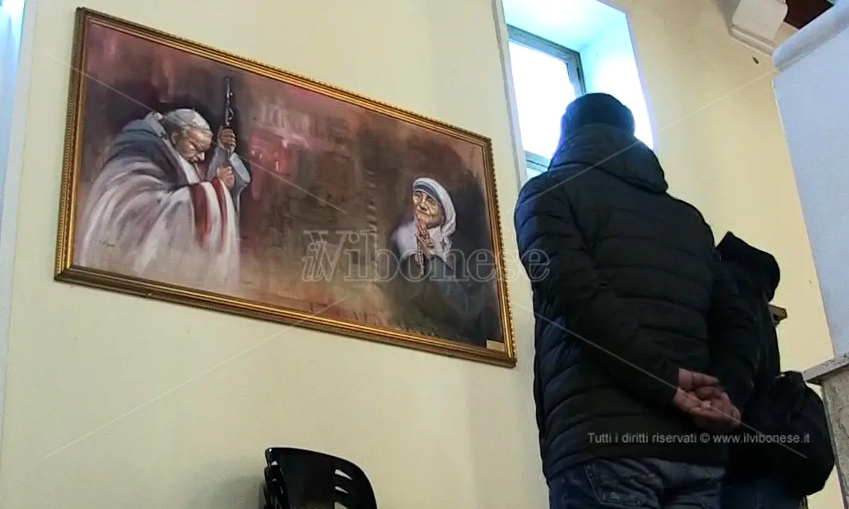 C’è una magnifica statua e, al fianco, da qualche tempo, un dipinto. La statua, antica, raffigura il santo, con la sua barba fluente, la fiamma ardente sulla Bibbia… Il quadro la riproduce ma – spiega il buon pastore – con «fattezze giovanili», alle sue spalle, appunto, la chiesa di Francica. Il quadro l’ha donato proprio Enzo Liguori. Sarà riffato alla comunità e il ricavato servirà a restaurare la facciata esterna della chiesa. Ma nella casa di Dio, a Francica, c’è un altro dipinto, donato alla parrocchia da Enzo Liguori. Mostra Papa Giovanni Paolo II all’apice della sua sofferenza terrena e mostra Madre Teresa di Calcutta. Opere di fede e devozione, un dono della comunità, quale è l’arte di Enzo Liguori.