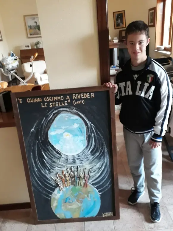 La disabilità come un valore aggiunto, un punto di forza. È questo il messaggio più forte della storia di Lorenzo. Il 18enne originario di San Costantino di Briatico frequenta il quarto anno del liceo artistico Colao di Vibo Valentia e, come i compagni delle superiori, sta seguendo le lezioni a distanza a causa della emergenza sanitaria. Così come accaduto durante i mesi primaverili in pieno lockdown: «In quel periodo stavamo studiando Dante e mi aveva molto colpito una frase in particolare, “E quindi uscimmo a riveder le stelle”. Il disegno che ho fatto rappresenta l’uscita da questa epidemia molto brutta».