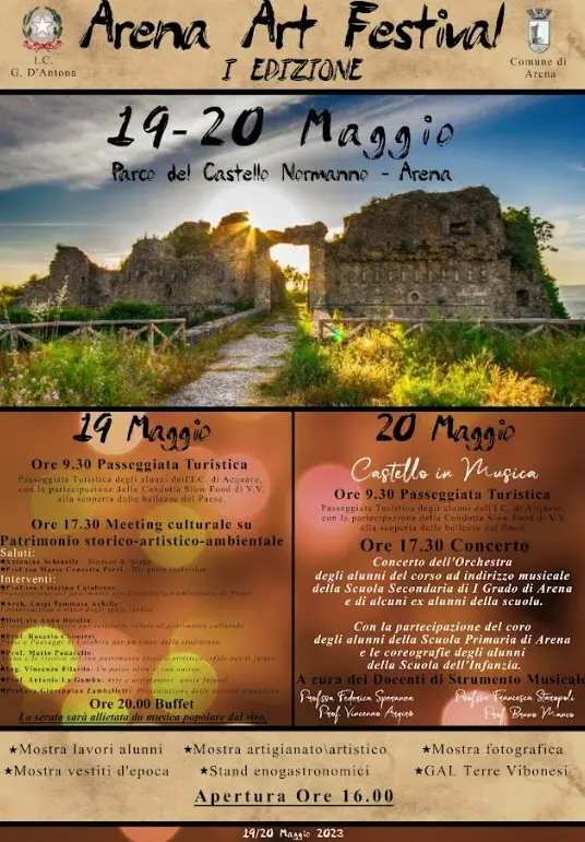Ad animare il festival, ricco e variegato sul piano dei contenuti e dei lavori inediti, «per molti aspetti sorprendenti per le fattezze e bellezza compositiva» – assicura la Preside Calabrese, ex dirigente del Liceo Scientifico autrice del volume Il Castello di Arena, sono diverse iniziative di valore storico, culturale, educativo, turistico. «Si parte dalle passeggiate turistiche alla scoperta delle bellezze e della storia e si chiude con il concerto dei ragazzi della scuola media, guidati dai loro docenti. Il tutto si svolgerà nel Parco del Castello Normanno con spazi riempiti di mostre, fiori, postazioni tipiche dello street food, musica e tanto altro. L’interesse dell’evento non si concentra solo nell’esposizione di lavori di qualità, ma soprattutto nella possibilità di leggere il tessuto storico e culturale di una cittadina e i diversi sedimenti culturali attraverso il suo patrimonio storico, artistico e ambientale con importanti riverberi nel territorio circostante. Il meeting culturale all’interno dell’evento si svolgerà in questo senso alla presenza di esperti del settore e di docenti universitari. L’importanza dell’evento è da ricercare nella necessità di tutelare, conservare, far conoscere un patrimonio di inestimabile valore che da solo può testimoniare il cammino culturale e storico di Arena, l’unica vera dimensione per conoscere le nostre radici e da cui ripartire in forma moderna e tecnologica per una possibile rivitalizzazione. Arena prova ancora una volta la sfida, con il dinamismo culturale che da sempre la caratterizza, per rendersi capace di attirare pubblico e interesse».