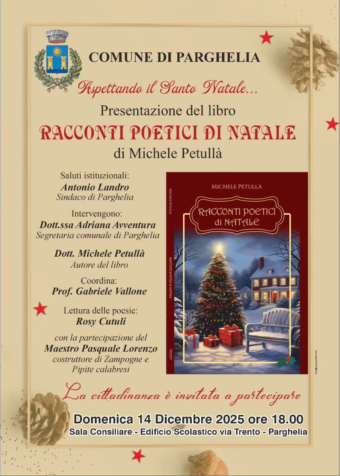 Un Natale che sceglie di farsi ascolto, riflessione e condivisione culturale. Domenica 14 dicembre, con inizio alle ore 18, la sala consiliare del Comune di Parghelia ospiterà la presentazione del libro Racconti Poetici di Natale di Michele Petullà, poeta e scrittore, nonché giornalista e sociologo, edito dalla Casa Editrice Libritalia di Enrico Buonanno e Simona Toma.