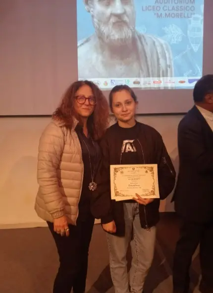 I tre vincitori esterni provengono dai licei Maurolico di Messina (secondo e terzo posto: Mirko Aveni e Claudio Calabrò), mentre la vincitrice è risultata una studentessa del Liceo G. Carducci di Nola, Serena Labanchi, dell’ultimo anno di corso, sezione D, presente in foto insieme alla sua docente Patrizia Sorrentino. E proprio in terra campana in aprile sarà ospite per il Certamen Nolanum il Liceo Morelli, rappresentato da due alunne della IV D, Giovanna Grillo ed Emanuela Pontoriero, opportunamente preparate dalla professoressa Preta, che si cimenteranno nella traduzione di un passo di Virgilio o Tacito. Molto seguita la profonda lectio magistralis del docente Davide Paolillo, ex studente del Morelli, incentrata sull’imperialismo ateniese, che ha ripreso il monito isocrateo e, prim’ancora, tucidideo, contro lo strapotere dei forti sui deboli, spaziando nei vari periodi della storia dell’Occidente, fino alle odierne guerre. Particolarmente apprezzata è stata poi la performance teatrale delle alunne del Morelli, coordinate dalla professoressa Federica Geraci che, attraverso recitazione, danza e canto, hanno ripreso, in una forma di ‘teatro minimale’, salienti passi di autori della classicità e della contemporaneità, elevando il potente grido contro la guerra. L’evento di premiazione, dopo la consegna di un attestato di partecipazione a tutti i partecipanti, ha vissuto un momento di forte commozione, nel ricordo di Silvia Scardamaglia, ex alunna del Morelli, tragicamente deceduta qualche giorno fa. Al suo ricordo è stata dedicata la giornata.