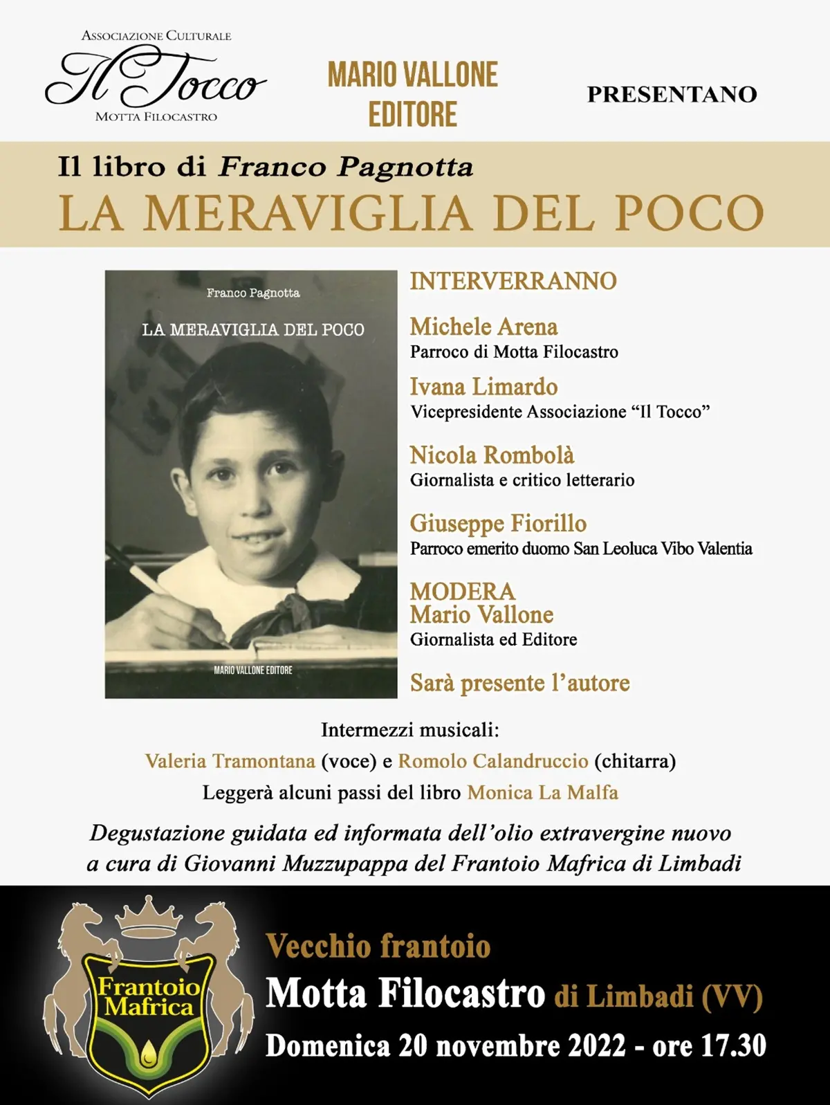 Domenica, 20 novembre, nel suggestivo borgo di Motta Filocastro, frazione di Limbadi, alle ore 17.30, ci sarà la presentazione del libro “La meraviglia del poco”, scritto da Franco Pagnotta (giornalista e scrittore). La sede dell’incontro sarà un luogo carico di memoria ed evocativo, un vecchio frantoio che risale al ‘700, un esempio ormai raro che rappresenta una sorta di dimora-museo. Un luogo suggestivo in sintonia con i racconti contenuti nel libro, che viaggiano nel passato e recuperano gli anni dell’infanzia dello stesso scrittore, a cavallo tra gli anni ’50 e ’60, caratterizzato da una civiltà, quella contadina, ancora immune dal consumismo e dalla mutazione antropologica che avrebbe cambiato il volto della società a partire dagli anni ‘70. L’opera può essere considerata un diario nella memoria dell’autore in quel mondo che Giuseppe Berto, nel 1972, ha definito come “la ricchezza della povertà” riferendosi al grande patrimonio della civiltà contadina, a cui i calabresi stavano voltando le spalle, per abbracciare i modelli borghesi legati ai processi dell’industrializzazione.