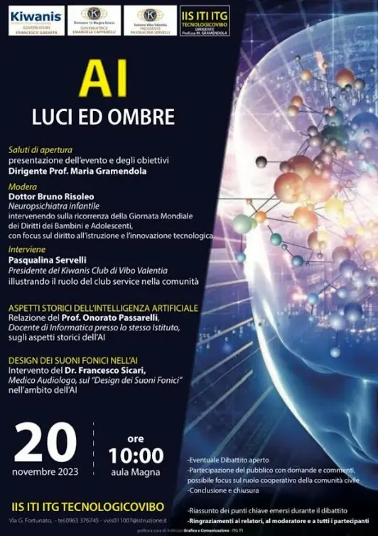In occasione della “Giornata internazionale per i diritti dell’infanzia e dell’adolescenza” il Kiwanis Club di Vibo Valentia ha programmato un convegno, presso l’istituto Iti-Itg del capoluogo, per il prossimo lunedì 20 novembre. L’argomento, importante oggetto del dibattito, tratterà i vari aspetti dell’intelligenza artificiale e le conseguenze sui giovani studenti. Nell’incontro interverranno la padrona di casa, dirigente Maria Gramendola, modererà Bruno Risoleo neuropsichiatra infantile, che parlerà del diritto all’istruzione e dell’innovazione tecnologica. Interverranno poi Pasqualina Servelli, presidente del Kiwanis Club di Vibo Valentia, e i relatori Onorato Passarelli, docente dello stesso Istituto che passerà in rassegna gli aspetti storici dell’AI, e Franco Sicari medico audiologo che relazionerà sul “Design dei suoni fonici” sempre nell’ambito dell’intelligenza artificiale.