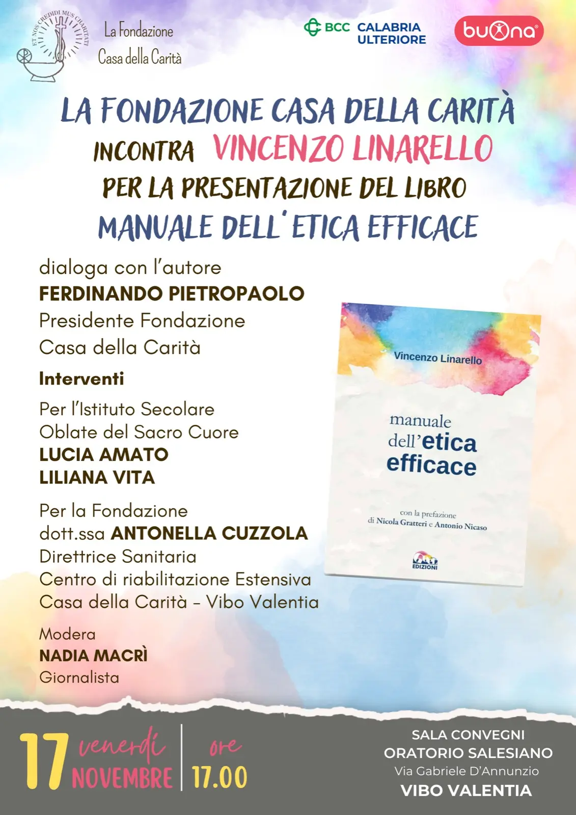 La sala convegni dell’oratorio salesiano di Vibo Valentia, nel pomeriggio di oggi, 17 novembre, dalle ore 17.00, ospiterà la presentazione del libro “Manuale dell’etica efficace” di Vincenzo Linarello. L’iniziativa è stata fortemente voluta dalla Fondazione casa della carità. Dialogherà con l’autore, Ferdinando Pietropaolo, presidente della Fondazione. Previsti gli interventi, per l’istituto secolare Oblate del Sacro cuore, di Lucia Amato e Liliana Vita; per la Fondazione, Antonella Cuzzola, direttrice sanitaria del centro di riabilitazione estensiva Casa della carità. A Moderare, la giornalista Nadia Macrì.