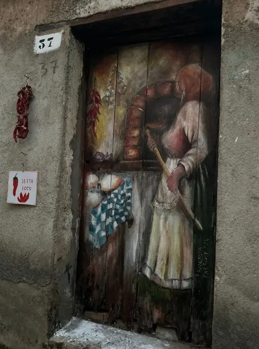 Dalla mostra fotografica “Scatti del Passato” a quella di antiche tessiture e ricami, passando ancora per quella di pittura dell’artista e avvocato del posto Mimmo Romanò. Diversi angoli, porte e persino la pavimentazione del vicolo sono stati decorati con figure e murales riproducenti scene di vita antica. Sulle mattonelle sono invece incisi detti e proverbi della tradizione contadina locale.