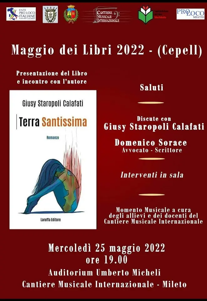 Sbarca a Mileto “Terra Santissima”, l’ultima fatica letteraria della scrittrice vibonese Giusy Staropoli Calafati. Il libro, candidato all’annuale edizione del Premio Strega, sarà presentato questa sera 25 maggio alle 19 nell’auditorium “Umberto Micheli” del Cantiere musicale internazionale, scuola di alta formazione attiva nella cittadina normanna all’interno della splendida cornice dell’ottocentesco palazzo San Giuseppe. L’evento culturale viene proposto nell’ambito di “Patti per la lettura” tra Comuni, di “Maggio dei libri 2022” e di “Vibo Capitale del Libro 2021”. Partner dell’iniziativa, l’Amministrazione cittadina di Mileto e il Comune di Vibo Valentia, di concerto con l’Ente Pro Loco Italiane e la medesima locale associazione turistica, con sede nella villa comunale. Il programma della manifestazione, dopo i saluti delle autorità presenti, prevede la presentazione del romanzo “Terra Santissima” e il colloquio-discussione sul tema tra l’autrice e l’avvocato-scrittore Domenico Sorace. Seguiranno gli eventuali interventi in sala del pubblico e un momento musicale proposto dagli allievi e dai docenti del Cmi. Nel corso della serata, tra l’altro, saranno consegnate agli studenti della scuola di alta formazione che si sono maggiormente distinti nel corso dell’anno accademico – residenti nel Comune di Mileto – le borse di studio in danaro messe a disposizione dall’Amministrazione cittadina in loro sostegno.