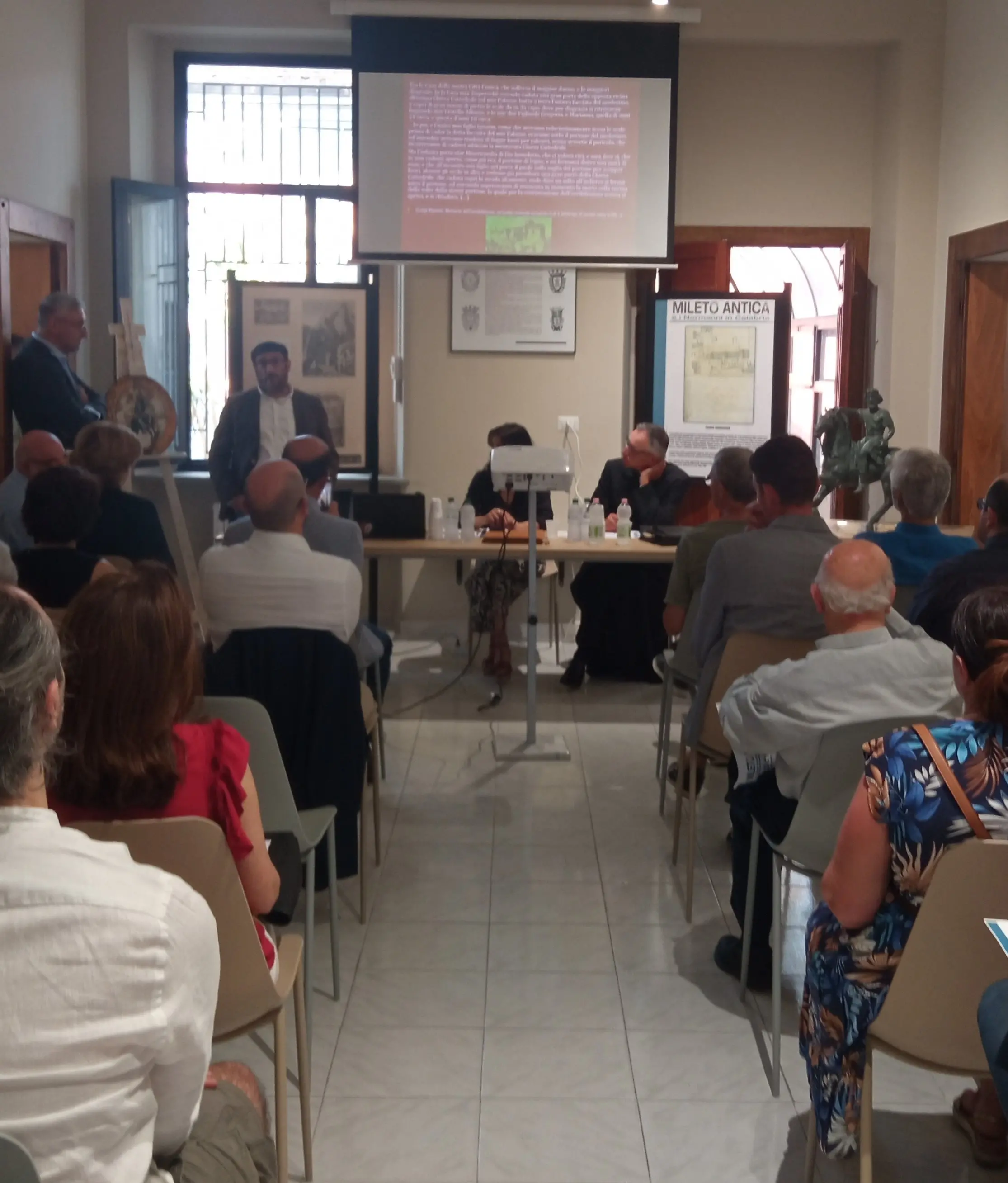 Al convegno ha dato il suo valido apporto anche l’archeologo Francesco Cuteri, artefice di una serie di scavi «in un insediamento normanno di grande interesse e che non finisce mai di stupire». Lo studioso, soffermandosi sul “Tesoro della Cattedrale e sui primi scavi nella distrutta Mileto” e attingendo ad alcuni antichi documenti, ha raccontato episodi, drammi e tragedie umane, sociali e archeologiche vissuti in quei concitati momenti dai miletesi, in seguito agli eventi tellurici del 1783. Di Parco archeologico e delle sue prospettive di sviluppo ha poi parlato l’archeologo Manuel Zinnà, membro dell’ente gestore “Mnemosyne”. Hanno completato il quadro le altrettanto valide relazioni degli studiosi Marilisa Morrone (Il riuso nella Mileto antica e moderna) e Vincenzo Naymo (Le pergamene dell’Archivio storico diocesano di Mileto), del musicologo Luigi Abbruzzo (I normanni in Italia meridionale: una inconsapevole rivoluzione musicale) e della socia della Milesia Giulia Fresca (Le istituzioni civiche di Mileto tra il ‘600 e il ‘700). Nel corso del convegno è stato letto anche uno stralcio della relazione sul tema “Mileto dall’età normanno-sveva alla dominazione angioina”, inviata dal vescovo emerito, monsignor Luigi Renzo. Documento da cui si evince, tra l’altro, che Mileto, «pur avendo vissuto il suo zenith di gloria al tempo dei Normanni, di fatto andò affermandosi concretamente proprio durante la dominazione angioina».