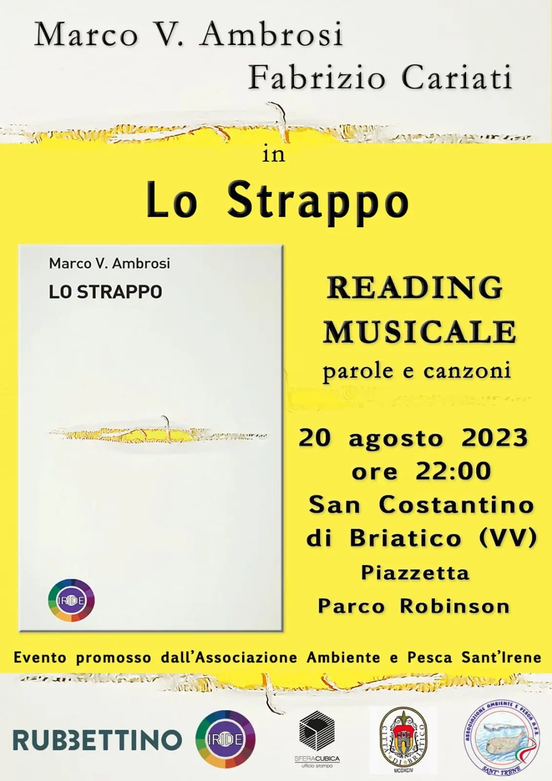 Il parco Robinson di San Costantino di Briatico ospiterà il 20 agosto, dalle ore 22.00 un evento capace di unire musica e parole. Il reading musicale sarà a cura di Marco Ambrosi e Fabrizio Cariati. L’evento è promosso dall’aps Associazione ambiente e pesca Sant’Irene (di cui è presidente Antonino Lo Iacono e tesoriere Giuseppe Bagnato) insieme ad amici e volontari, con il patrocinio del Comune di Briatico. Il sodalizio è stato costituito di recente e oltre alla pesca dilettantistica promuove momenti di socialità e di sensibilizzazione alla tutela del mare, rimozione rifiuti in spiaggia libera e manifestazioni per avvicinare i bambini alla pesca. Protagonista della serata, “Lo strappo”, edito Iride (Gruppo Rubbettino), di Marco Ambrosi, chitarrista del gruppo ‘I nuju”. Si tratta di un romanzo di formazione che attraversa gli ultimi trent’anni di rock alternativo italiano. I 21 brevi capitoli del romanzo, più un prologo e un epilogo, recano i titoli di altrettanti brani pop e rock celebri, da “Smells Like Teen Spirits” dei Nirvana, a “Growing up” di Bruce Springsteen a “Quando sarai grande” di Edoardo Bennato. Brani da ascoltare mentre si seguono le vicende del protagonista, Tommaso Mori. Partito da un paesino della Calabria per Bologna alla fine degli anni ’90, Tommy ha sempre sognato di diventare una rockstar. Giunto all’età di quarant’anni decide di tirare le somme e scrivere un’autobiografia: dai primi concerti sgangherati, fino ai palchi più importanti di Italia.