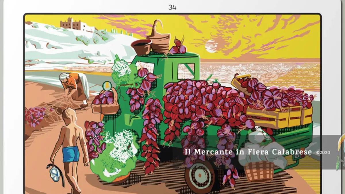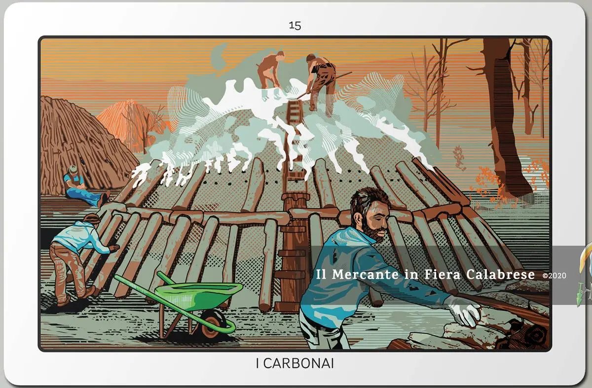 Quaranta pittografie intimamente legate alla cultura calabrese, realizzate dall’artista Luca Viapiana, con colori densi, per comporre una geografia emotiva della regione. Un viaggio attraverso i luoghi, i personaggi famosi, le tradizioni, le usanze, i prodotti tipici. Un percorso teso ad esaltare l’identità calabrese fatta di immagini simboliche che tuttavia non restituiscono la solita visione stereotipata della regione, ma contribuiscono, invece, a coglierne gli aspetti in cui ogni calabrese può riconoscersi e ritrovare un pezzo di sé. Un omaggio alla terra di Calabria costituito da quaranta splendidi disegni, ognuno corredato da un testo informativo frutto di un attento lavoro filologico. Sono quattro le carte dedicate al territorio vibonese: 34 – la cipolla (Tropea), 38 – la ‘nduja (Spilinga), 27 – la Mamma (Natuzza), 15 – i carbonai (Serra San Bruno).